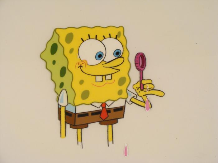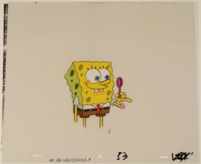 To create production cels, the original animator's drawing is transferred onto an acetate cel (by hand-inking and/or photo copying). The cel is then hand-painted on the reverse side. The cel is ready to be matted and framed. The animator's notations are at the bottom of the cel. The cel is multilayered: first is the outline of the bubble drops, then the filler for the bubble drops, next is Spongebob's eyes, and the finally the main image of Spongebob.