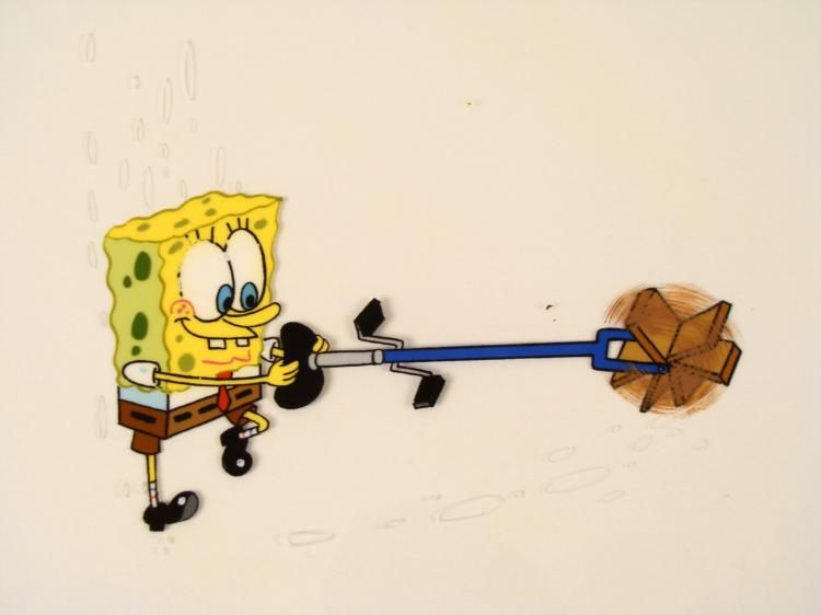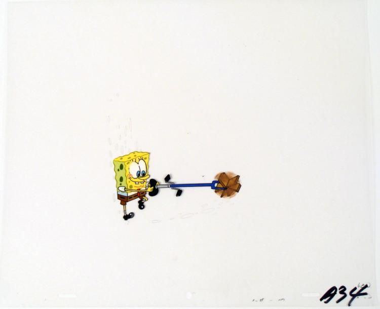 This original animation cel is from the Nickelodeon TV show SpongeBob Squarepants. The story takes place under the deep blue sea in Bikini Bottom, where SpongeBob resides. SpongeBob, who is a yellow, porous sponge, is your typical happy-go-lucky character, * as he is always cheerful and enjoys making people laugh. Patrick Star, SpongeBob's neighbor who is a starfish, is your average children's show idiot, as he boasts knowing nothing and is often getting himself into ridiculous situations. Between the homes of * these two lies the home of the miserable Squidward, a squid, who is known for being grouchy and playing tricks on SpongeBob and Patrick. Both SpongeBob and Squidward work at the Krusty Krab, a fast food business run by the greedy money-loving Mr. Krabs, a * crab, the arch rival of the evil, possibly misunderstood, Plankton. Another neighbor, Sandy Cheeks, an athletic squirrel who normally wears an astronaut's space suit, was introduced in "Tea at the Treedome." She spends most of her time inventing and experimenting. * * My new invention! A unicycle with a wooden propeller... Powerful stuff! * * * * * Original Production Animated Cel Overall Size of Cel: 10 1/2" x 12 1/2" Very Good Condition * This is an original hand-painted cel was used in the production of an episode of "SpongeBob SquarePants." Each one-of-a-kind cel * represents a slight change in position of the characters. When individually photographed and projected in rapid succession, the images appear to move. * * To create production cels, the original animator's drawing is transferred onto an acetate cel (by hand-inking and/or photo copying). The cel is then hand-painted on the reverse side. * * * The cel is ready to be matted and framed. The animator's notations are at the bottom of the cel. There is some slight paint fade to Spongebob's outline. * * *
