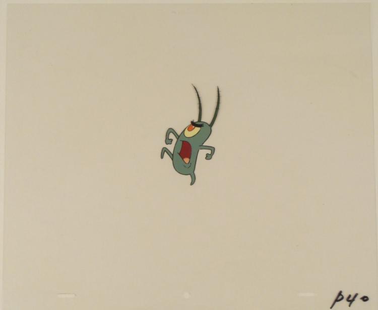 This original animation cel is from the Nickelodeon TV show SpongeBob Squarepants. The story takes place under the deep blue sea in Bikini Bottom, where SpongeBob resides. SpongeBob, who is a yellow, porous sponge, is your typical happy-go-lucky character, as he is always cheerful and enjoys making people laugh. Patrick Star, SpongeBob's neighbor who is a starfish, is your average children's show idiot, as he boasts knowing nothing and is often getting himself into ridiculous situations. Between the homes of these two lies the home of the miserable Squidward, a squid, who is known for being grouchy and playing tricks on SpongeBob and Patrick. Both SpongeBob and Squidward work at the Krusty Krab, a fast food business run by the greedy money-loving Mr. Krabs, a crab, the arch rival of the evil, possibly misunderstood, Plankton. Another neighbor, Sandy Cheeks, an athletic squirrel who normally wears an astronaut's space suit, was introduced in "Tea at the Treedome." She spends most of her time inventing and experimenting. * Plankton is putting his foot down, once and for all... * Original Production Animated Cel Overall Size of Cel: 10 1/2" x 20 1/2" Very Good Condition This is an original hand-painted cel set-up used in the production of an episode of "SpongeBob SquarePants." Each one-of-a-kind set-up represents a slight change in position of the characters. When individually photographed and projected in rapid succession, the images appear to move. * To create production cels, the original animator's drawing is transferred onto an acetate cel (by hand-inking and/or photo copying). The cel is then hand-painted on the reverse side. * The cel is ready to be matted and framed. The animator's notations are at the bottom of the cel. There is some slight fading to Plankton's outline. *