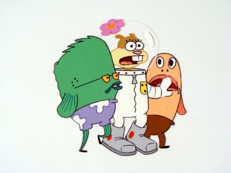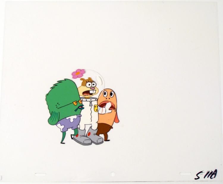 This original animation cel is from the Nickelodeon TV show SpongeBob Squarepants. The story takes place under the deep blue sea in Bikini Bottom, where SpongeBob resides. SpongeBob, who is a yellow, porous sponge, is your typical happy-go-lucky character, * as he is always cheerful and enjoys making people laugh. Patrick Star, SpongeBob's neighbor who is a starfish, is your average children's show idiot, as he boasts knowing nothing and is often getting himself into ridiculous situations. Between the homes of * these two lies the home of the miserable Squidward, a squid, who is known for being grouchy and playing tricks on SpongeBob and Patrick. Both SpongeBob and Squidward work at the Krusty Krab, a fast food business run by the greedy money-loving Mr. Krabs, a * crab, the arch rival of the evil, possibly misunderstood, Plankton. Another neighbor, Sandy Cheeks, an athletic squirrel who normally wears an astronaut's space suit, was introduced in "Tea at the Treedome." She spends most of her time inventing and experimenting. * * Hold up you two, let me check this out first... * * * * * Original Production Animated Cel Overall Size of Cel: 10 1/2" x 12 1/2" Very Good Condition * This is an original hand-painted cel was used in the production of an episode of "SpongeBob SquarePants." Each one-of-a-kind cel * represents a slight change in position of the characters. When individually photographed and projected in rapid succession, the images appear to move. * * To create production cels, the original animator's drawing is transferred onto an acetate cel (by hand-inking and/or photo copying). The cel is then hand-painted on the reverse side. * * * * * The cel received by the winning bidder may be ever so slightly different from that in the auction photo. * * * * The cel is ready to be matted and framed. The animator's notations are at the bottom of the cel. There is some slight paint to Sandy and the pink fish's outline. * * *