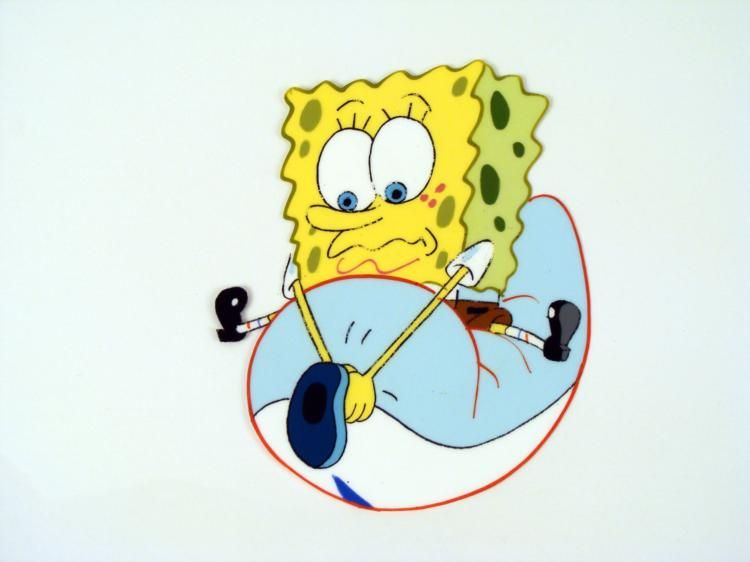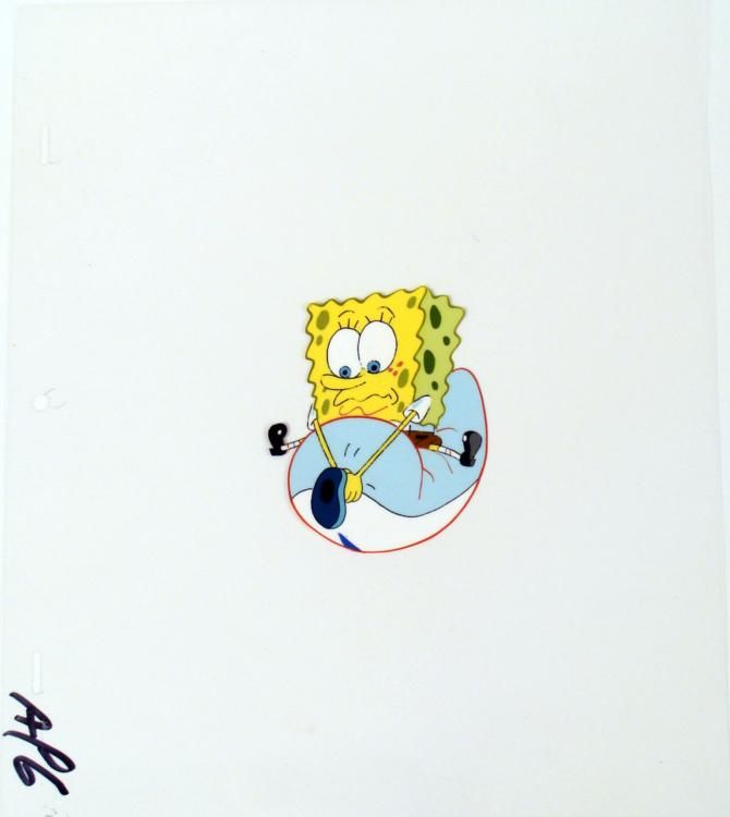 This original animation cel is from the Nickelodeon TV show SpongeBob Squarepants. The story takes place under the deep blue sea in Bikini Bottom, where SpongeBob resides. SpongeBob, who is a yellow, porous sponge, is your typical happy-go-lucky character, * as he is always cheerful and enjoys making people laugh. Patrick Star, SpongeBob's neighbor who is a starfish, is your average children's show idiot, as he boasts knowing nothing and is often getting himself into ridiculous situations. Between the homes of * these two lies the home of the miserable Squidward, a squid, who is known for being grouchy and playing tricks on SpongeBob and Patrick. Both SpongeBob and Squidward work at the Krusty Krab, a fast food business run by the greedy money-loving Mr. Krabs, a * crab, the arch rival of the evil, possibly misunderstood, Plankton. Another neighbor, Sandy Cheeks, an athletic squirrel who normally wears an astronaut's space suit, was introduced in "Tea at the Treedome." She spends most of her time inventing and experimenting. * * I knew I shouldn't have blown my hat up this big... * * * * * Original Production Animated Cel Overall Size of Cel: 10 1/2" x 12 1/2" Very Good Condition * This is an original hand-painted cel was used in the production of an episode of "SpongeBob SquarePants." Each one-of-a-kind cel * represents a slight change in position of the characters. When individually photographed and projected in rapid succession, the images appear to move. * * To create production cels, the original animator's drawing is transferred onto an acetate cel (by hand-inking and/or photo copying). The cel is then hand-painted on the reverse side. * * * The cel is ready to be matted and framed. The animator's notations are at the bottom of the cel. There is some slight paint fade to Spongebob's outline. * * *