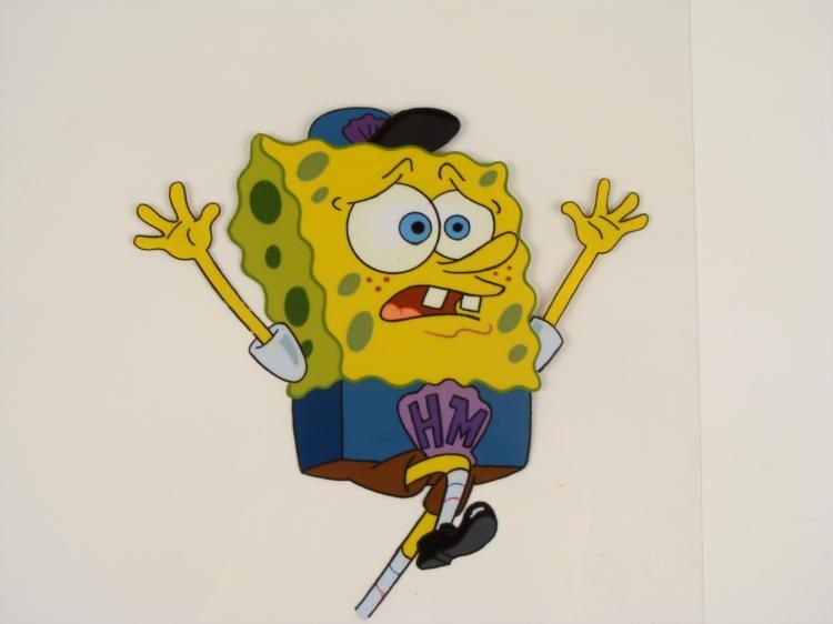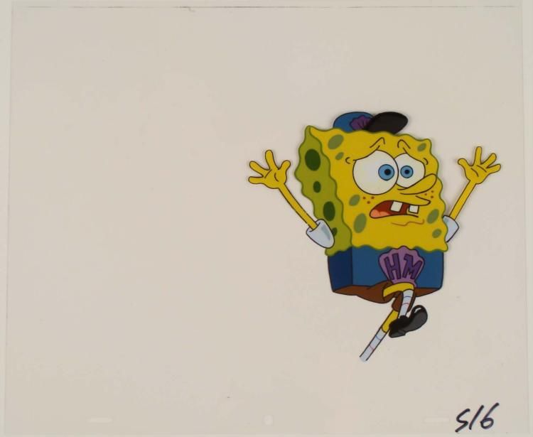 Normal 0 false false false MicrosoftInternetExplorer4 /* Style Definitions */ table.MsoNormalTable{mso-style-name:"Table Normal";mso-tstyle-rowband-size:0;mso-tstyle-colband-size:0;mso-style-noshow:yes;mso-style-parent:"";mso-padding-alt:0in 5.4pt 0in 5.4pt;mso-para-margin:0in;mso-para-margin-bottom:.0001pt;mso-pagination:widow-orphan;font-size:10.0pt;font-family:"Times New Roman";mso-ansi-language:#0400;mso-fareast-language:#0400;mso-bidi-language:#0400;}This original animation cel is from the Nickelodeon TV showSpongeBob Squarepants. The story takes place under the deep blue seain Bikini Bottom, where SpongeBob resides. SpongeBob, who is a yellow,porous sponge, is your typical happy-go-lucky character, as he is alwayscheerful and enjoys making people laugh. Patrick Star, SpongeBob's neighbor whois a starfish, is your average children's show idiot, as he boasts knowingnothing and is often getting himself into ridiculous situations. Between the homesof these two lies the home of the miserable Squidward, a squid, who is knownfor being grouchy and playing tricks on SpongeBob and Patrick. Both SpongeBoband Squidward work at the Krusty Krab, a fast food business run by the greedymoney-loving Mr. Krabs, a crab, the arch rival of the evil, possiblymisunderstood, Plankton. Another neighbor, Sandy Cheeks, an athletic squirrelwho normally wears an astronaut's space suit, was introduced in "Tea atthe Treedome." She spends most of her time inventing andexperimenting. * WAIT, STOP!!! Shoot, I can't get fired on the first day again... * * Original Production Animated Cel Overall Size of Cel: 10 1/2" x 12 1/2" Very Good ConditionThis is an original hand-painted cel set-up used in the productionof an episode of "SpongeBob SquarePants." Each one-of-a-kind set-uprepresents a slight change in position of the characters. When individuallyphotographed and projected in rapid succession, the images appear to move. * To create production cels, the original animator's drawing is transferred ontoan acetate cel (by hand-inking and/or photo copying). The cel is thenhand-painted on the reverse side. * The cel is ready to be matted andframed. The animator's notations are atthe bottom of the cel. *