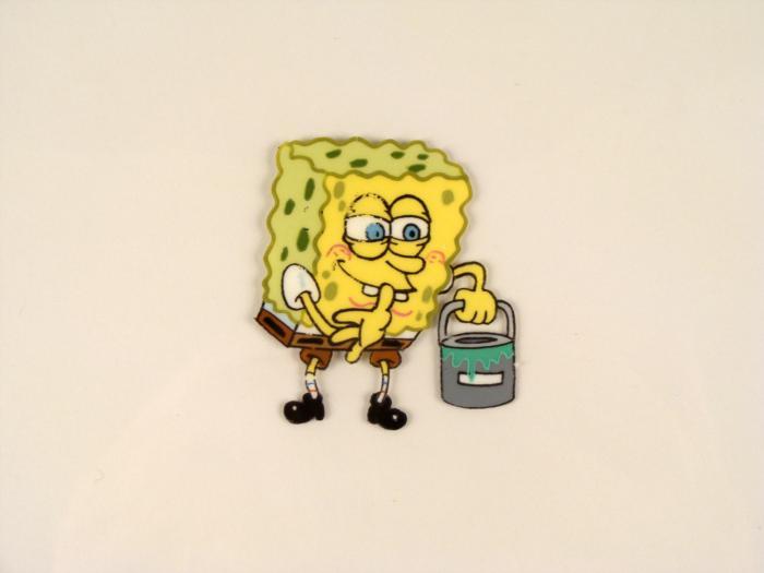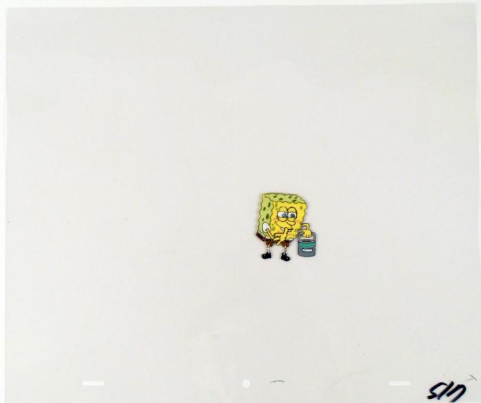 This original animation cel is from the Nickelodeon TV show SpongeBob Squarepants. The story takes place under the deep blue sea in Bikini Bottom, where SpongeBob resides. SpongeBob, who is a yellow, porous sponge, is your typical happy-go-lucky character, as he is always cheerful and enjoys making people laugh. Patrick Star, SpongeBob's neighbor who is a starfish, is your average children's show idiot, as he boasts knowing nothing and is often getting himself into ridiculous situations. Between the homes of these two lies the home of the miserable Squidward, a squid, who is known for being grouchy and playing tricks on SpongeBob and Patrick. Both SpongeBob and Squidward work at the Krusty Krab, a fast food business run by the greedy money-loving Mr. Krabs, a crab, the arch rival of the evil, possibly misunderstood, Plankton. Another neighbor, Sandy Cheeks, an athletic squirrel who normally wears an astronaut's space suit, was introduced in "Tea at the Treedome." She spends most of her time inventing and experimenting. Look what Spongebob has discovered, the wonders of green paint and the magic it can make.Original Production Animated Cel Overall Size of Cel: 10 1/2" x 12 1/2" Very Good ConditionThis is an original hand-painted cel set-up used in the production of an episode of "SpongeBob SquarePants." Each one-of-a-kind set-up represents a slight change in position of the characters. When individually photographed and projected in rapid succession, the images appear to move.
