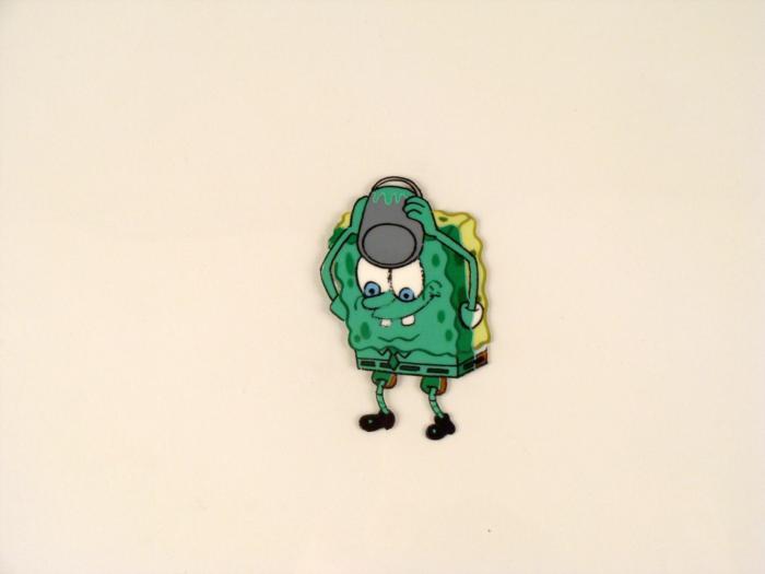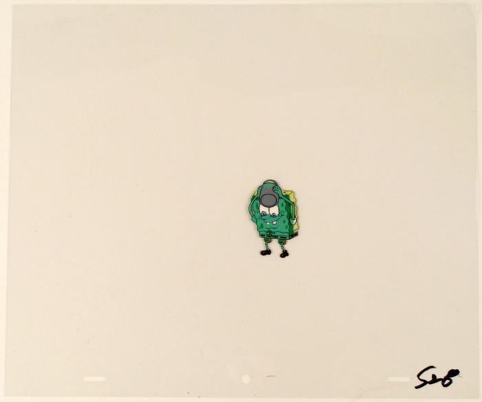 This original animation cel is from the Nickelodeon TV show SpongeBob Squarepants. The story takes place under the deep blue sea in Bikini Bottom, where SpongeBob resides. SpongeBob, who is a yellow, porous sponge, is your typical happy-go-lucky character, as he is always cheerful and enjoys making people laugh. Patrick Star, SpongeBob's neighbor who is a starfish, is your average children's show idiot, as he boasts knowing nothing and is often getting himself into ridiculous situations. Between the homes of these two lies the home of the miserable Squidward, a squid, who is known for being grouchy and playing tricks on SpongeBob and Patrick. Both SpongeBob and Squidward work at the Krusty Krab, a fast food business run by the greedy money-loving Mr. Krabs, a crab, the arch rival of the evil, possibly misunderstood, Plankton. Another neighbor, Sandy Cheeks, an athletic squirrel who normally wears an astronaut's space suit, was introduced in "Tea at the Treedome." She spends most of her time inventing and experimenting. Why is Spongebob making himself green?Original Production Animated Cel Overall Size of Cel: 10 1/2" x 12 1/2" Very Good ConditionThis is an original hand-painted cel set-up used in the production of an episode of "SpongeBob SquarePants." Each one-of-a-kind set-up represents a slight change in position of the characters. When individually photographed and projected in rapid succession, the images appear to move.