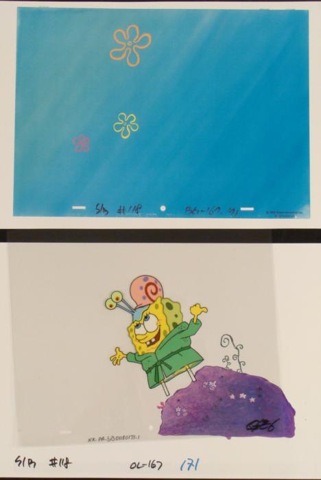 Offered here are two reproduction backgrounds (over and underlay) and an original animation cel from the Nickelodeon TV show SpongeBob Squarepants. The story takes place under the deep blue sea in Bikini Bottom, where SpongeBob resides. SpongeBob, who is a yellow, porous sponge, is your typical happy-go-lucky character, as he is always cheerful and enjoys making people laugh. Patrick Star, SpongeBob's neighbor who is a starfish, is your average children's show idiot, as he boasts knowing nothing and is often getting himself into ridiculous situations. Between the homes of these two lies the home of the miserable Squidward, a squid, who is known for being grouchy and playing tricks on SpongeBob and Patrick. Both SpongeBob and Squidward work at the Krusty Krab, a fast food business run by the greedy money-loving Mr. Krabs, a crab, the arch rival of the evil, possibly misunderstood, Plankton. Another neighbor, Sandy Cheeks, an athletic squirrel who normally wears an astronaut's space suit, was introduced in "Tea at the Treedome." She spends most of her time inventing and experimenting. Two thumbs up for effort. Original Production Background and Animated Cel Overall Size of Background: 11" x 17" Overall Size of the Cels: 10 1/2" x 14" Excellent ConditionThis is an original hand-painted cel set-up used in the production of an episode of "SpongeBob SquarePants." Each one-of-a-kind set-up represents a slight change in position of the characters. When individually photographed and projected in rapid succession, the images appear to move.