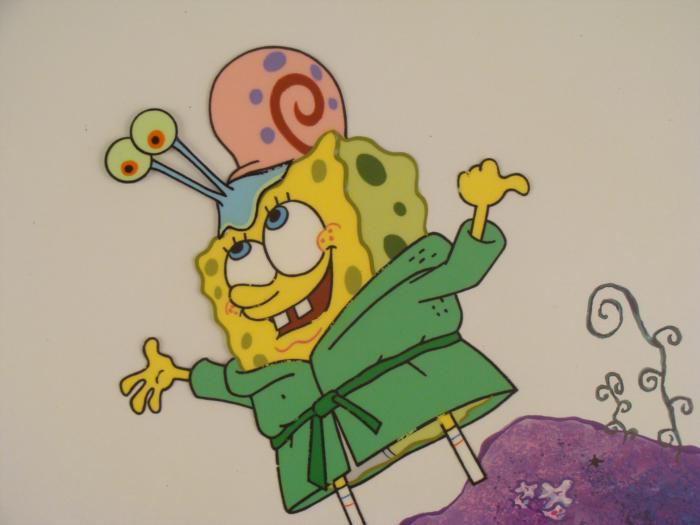 To create production cels, the original animator's drawing is transferred onto an acetate cel (by hand-inking and/or photo copying). The cel is then hand-painted on the reverse side. The background accompanying this set-up is a reproduction background. The cel received by the winning bidder may be ever so slightly different from the one in the auction photos. The background is ready to be matted and framed. It is a colored background with a cel and has the animator's notations at the bottom both. The cel has multi-layers: first is Gary's eyes and part of his body and next is Spongebob and Gary's shell.