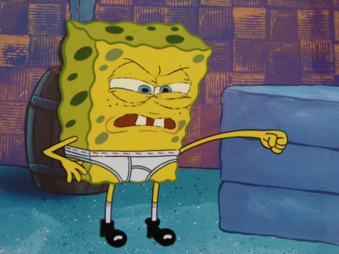 This animation cel and reproduction background are from the Nickelodeon TV show SpongeBob Squarepants. The story takes place under the deep blue sea in Bikini Bottom, where SpongeBob resides. SpongeBob, who is a yellow, porous sponge, is your typical happy-go-lucky character, as he is always cheerful and enjoys making people laugh. Patrick Star, SpongeBob's neighbor who is a starfish, is your average children's show idiot, as he boasts knowing nothing and is often getting himself into ridiculous situations. Between the homes of these two lies the home of the miserable Squidward, a squid, who is known for being grouchy and playing tricks on SpongeBob and Patrick. Both SpongeBob and Squidward work at the Krusty Krab, a fast food business run by the greedy money-loving Mr. Krabs, a crab, the arch rival of the evil, possibly misunderstood, Plankton. Another neighbor, Sandy Cheeks, an athletic squirrel who normally wears an astronaut's space suit, was introduced in "Tea at the Treedome." She spends most of her time inventing and experimenting. Now.. I... Am...... ANGRY!!!Original Printed Background and Animated Cel Overall Size of Background: 11" x 17" Overall Size of the Cel: 10 1/2" x 12 1/2" Very good condition This is an original hand-painted cel set-up used in the production of an episode of "SpongeBob SquarePants." Each one-of-a-kind set-up represents a slight change in position of the characters. When individually photographed and projected in rapid succession, the images appear to move.
