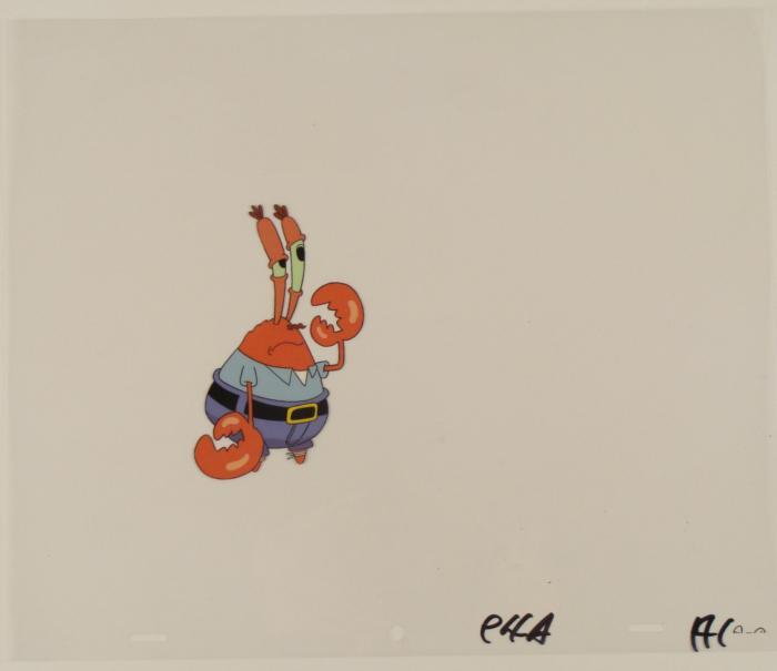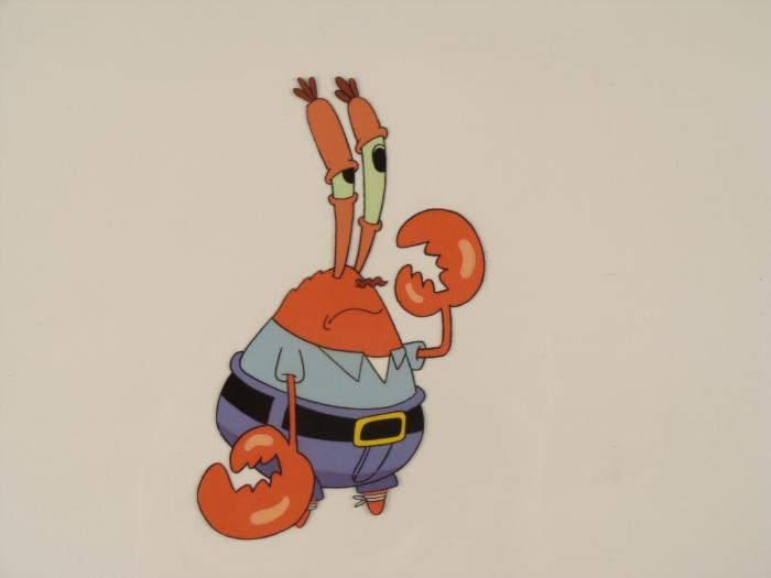 This original animation cel is from the Nickelodeon TV show SpongeBob Squarepants. The story takes place under the deep blue sea in Bikini Bottom, where SpongeBob resides. SpongeBob, who is a yellow, porous sponge, is your typical happy-go-lucky character, as he is always cheerful and enjoys making people laugh. Patrick Star, SpongeBob's neighbor who is a starfish, is your average children's show idiot, as he boasts knowing nothing and is often getting himself into ridiculous situations. Between the homes of these two lies the home of the miserable Squidward, a squid, who is known for being grouchy and playing tricks on SpongeBob and Patrick. Both SpongeBob and Squidward work at the Krusty Krab, a fast food business run by the greedy money-loving Mr. Krabs, a crab, the arch rival of the evil, possibly misunderstood, Plankton. Another neighbor, Sandy Cheeks, an athletic squirrel who normally wears an astronaut's space suit, was introduced in "Tea at the Treedome." She spends most of her time inventing and experimenting. Mr. Krabs seems to be confused!Original Production Animated Cel Overall Size of Cel: 10 1/2" x 12 1/2" Excellent ConditionThis is an original hand-painted cel set-up used in the production of an episode of "SpongeBob SquarePants." Each one-of-a-kind set-up represents a slight change in position of the characters. When individually photographed and projected in rapid succession, the images appear to move.
