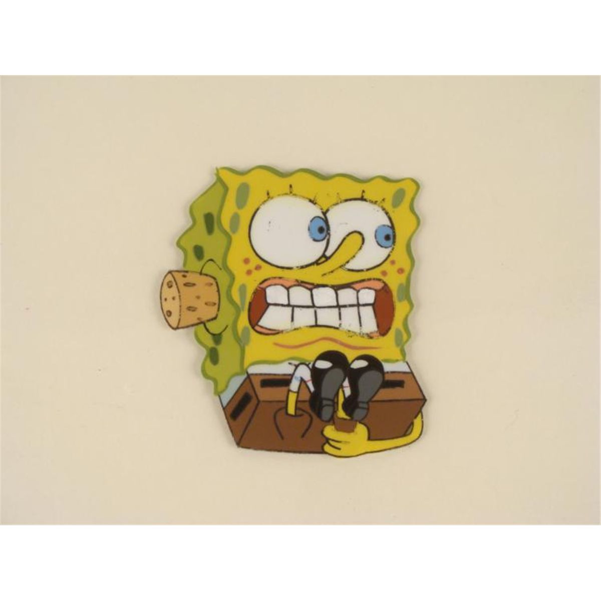 This original animation cel is from the Nickelodeon TV show SpongeBob Squarepants. The story takes place under the deep blue sea in Bikini Bottom, where SpongeBob resides. SpongeBob, who is a yellow, porous sponge, is your typical happy-go-lucky character, as he is always cheerful and enjoys making people laugh. Patrick Star, SpongeBob's neighbor who is a starfish, is your average children's show idiot, as he boasts knowing nothing and is often getting himself into ridiculous situations. Between the homes of these two lies the home of the miserable Squidward, a squid, who is known for being grouchy and playing tricks on SpongeBob and Patrick. Both SpongeBob and Squidward work at the Krusty Krab, a fast food business run by the greedy money-loving Mr. Krabs, a crab, the arch rival of the evil, possibly misunderstood, Plankton. Another neighbor, Sandy Cheeks, an athletic squirrel who normally wears an astronaut's space suit, was introduced in "Tea at the Treedome." She spends most of her time inventing and experimenting. * Shoot, once I touch down again, these ear plugs will render themselves useless. * Original Production Animated Cel Overall Size of Cel: 10 1/2" x 12 1/2" Very Good ConditionThis is an original hand-painted cel set-up used in the production of an episode of "SpongeBob SquarePants." Each one-of-a-kind set-up represents a slight change in position of the characters. When individually photographed and projected in rapid succession, the images appear to move. * To create production cels, the original animator's drawing is transferred onto an acetate cel (by hand-inking and/or photo copying). The cel is then hand-painted on the reverse side. * The cel received by the winning bidder may be ever so slightly different from the one in the auction photos. * The cel is ready to be matted and framed. The animator's notations are at the bottom of the cel. There is some paint fade to Spongebob's outline. *