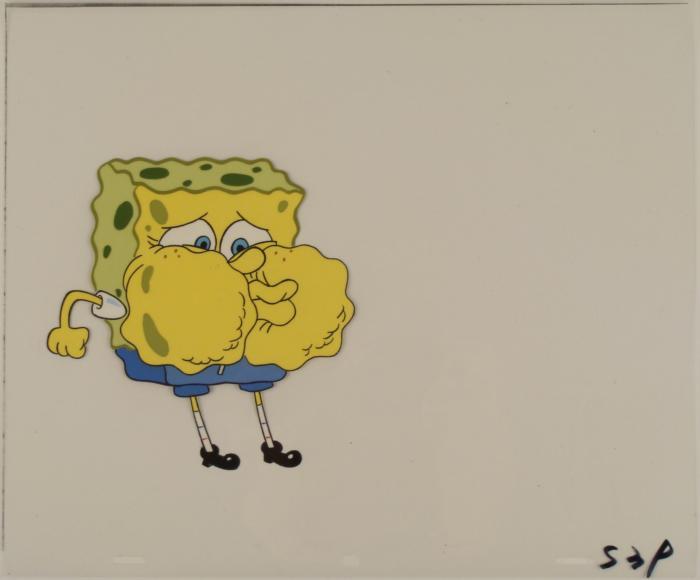This original animation cel is from the Nickelodeon TV show SpongeBob Squarepants. The story takes place under the deep blue sea in Bikini Bottom, where SpongeBob resides. SpongeBob, who is a yellow, porous sponge, is your typical happy-go-lucky character, as he is always cheerful and enjoys making people laugh. Patrick Star, SpongeBob's neighbor who is a starfish, is your average children's show idiot, as he boasts knowing nothing and is often getting himself into ridiculous situations. Between the homes of these two lies the home of the miserable Squidward, a squid, who is known for being grouchy and playing tricks on SpongeBob and Patrick. Both SpongeBob and Squidward work at the Krusty Krab, a fast food business run by the greedy money-loving Mr. Krabs, a crab, the arch rival of the evil, possibly misunderstood, Plankton. Another neighbor, Sandy Cheeks, an athletic squirrel who normally wears an astronaut's space suit, was introduced in "Tea at the Treedome." She spends most of her time inventing and experimenting. Original Production Animated Cel Overall Size of Cel: 10 1/2" x 12 1/2" Excellent ConditionThis is an original hand-painted cel set-up used in the production of an episode of "SpongeBob SquarePants." Each one-of-a-kind set-up represents a slight change in position of the characters. When individually photographed and projected in rapid succession, the images appear to move.