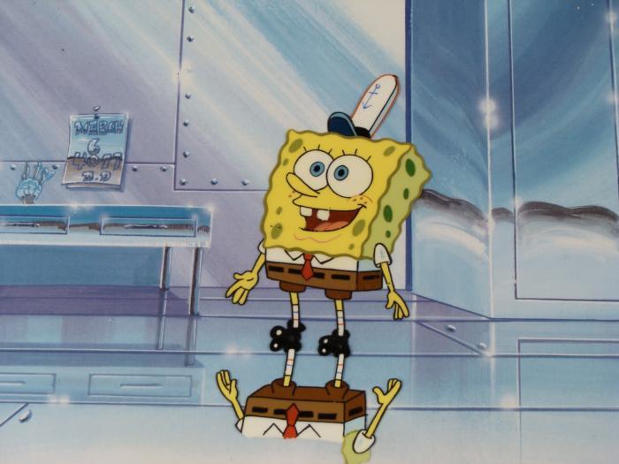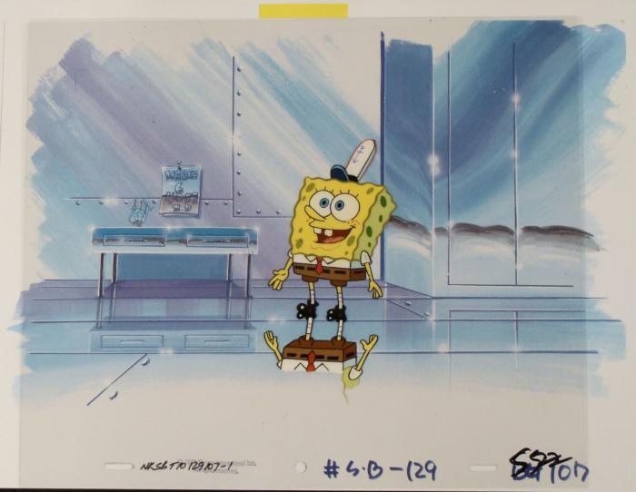 This animation cel and reproduction background are from the Nickelodeon TV show SpongeBob Squarepants. The story takes place under the deep blue sea in Bikini Bottom, where SpongeBob resides. SpongeBob, who is a yellow, porous sponge, is your typical happy-go-lucky character, as he is always cheerful and enjoys making people laugh. Patrick Star, SpongeBob's neighbor who is a starfish, is your average children's show idiot, as he boasts knowing nothing and is often getting himself into ridiculous situations. Between the homes of these two lies the home of the miserable Squidward, a squid, who is known for being grouchy and playing tricks on SpongeBob and Patrick. Both SpongeBob and Squidward work at the Krusty Krab, a fast food business run by the greedy money-loving Mr. Krabs, a crab, the arch rival of the evil, possibly misunderstood, Plankton. Another neighbor, Sandy Cheeks, an athletic squirrel who normally wears an astronaut's space suit, was introduced in "Tea at the Treedome." She spends most of her time inventing and experimenting. It looks like Spongebob has come up with another great idea...Original Printed Background and Animated Cel Overall Size of Background: 11" x 17" Overall Size of the Cel: 10 1/2" x 12 1/2" Very good condition This is an original hand-painted cel set-up used in the production of an episode of "SpongeBob SquarePants." Each one-of-a-kind set-up represents a slight change in position of the characters. When individually photographed and projected in rapid succession, the images appear to move.