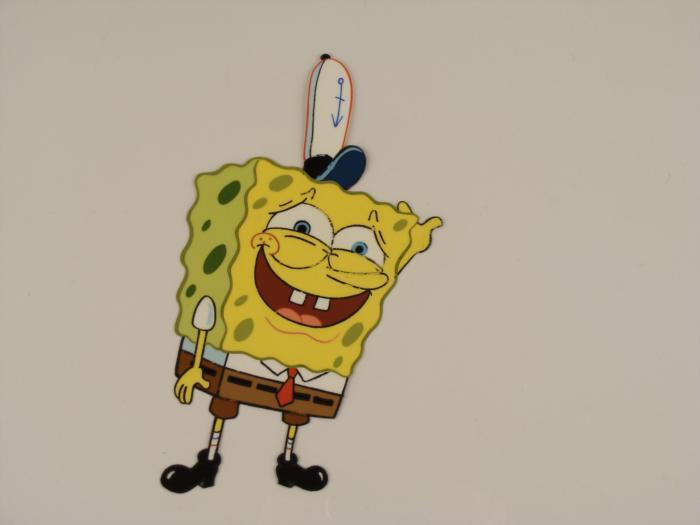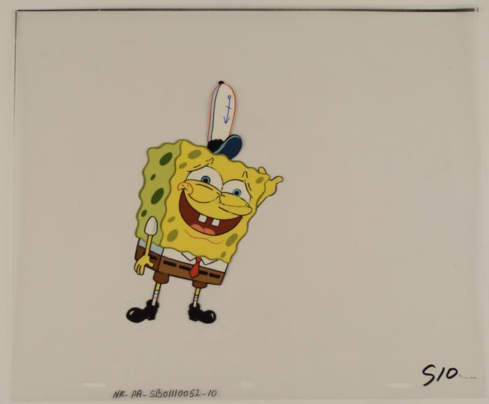 This original animation cel is from the Nickelodeon TV show SpongeBob Squarepants. The story takes place under the deep blue sea in Bikini Bottom, where SpongeBob resides. SpongeBob, who is a yellow, porous sponge, is your typical happy-go-lucky character, as he is always cheerful and enjoys making people laugh. Patrick Star, SpongeBob's neighbor who is a starfish, is your average children's show idiot, as he boasts knowing nothing and is often getting himself into ridiculous situations. Between the homes of these two lies the home of the miserable Squidward, a squid, who is known for being grouchy and playing tricks on SpongeBob and Patrick. Both SpongeBob and Squidward work at the Krusty Krab, a fast food business run by the greedy money-loving Mr. Krabs, a crab, the arch rival of the evil, possibly misunderstood, Plankton. Another neighbor, Sandy Cheeks, an athletic squirrel who normally wears an astronaut's space suit, was introduced in "Tea at the Treedome." She spends most of her time inventing and experimenting. Hold their Spongebob, you aren't going anywhere...Original Production Animated Cel Overall Size of Cel: 10 1/2" x 12 1/2" Excellent ConditionThis is an original hand-painted cel set-up used in the production of an episode of "SpongeBob SquarePants." Each one-of-a-kind set-up represents a slight change in position of the characters. When individually photographed and projected in rapid succession, the images appear to move.
