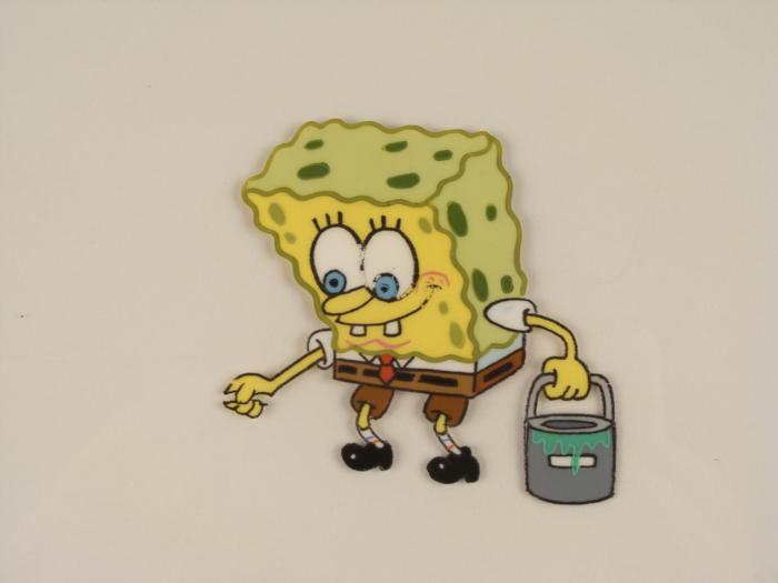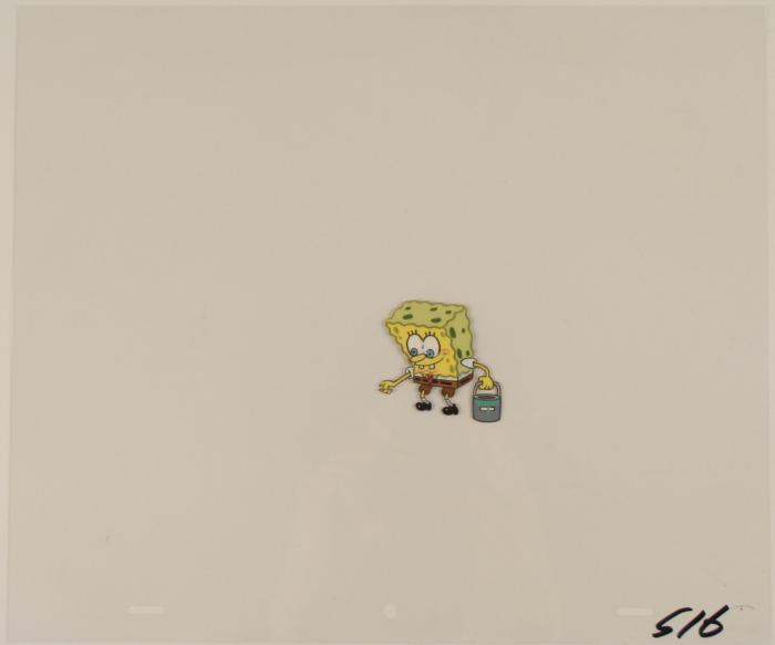 This original animation cel is from the Nickelodeon TV show SpongeBob Squarepants. The story takes place under the deep blue sea in Bikini Bottom, where SpongeBob resides. SpongeBob, who is a yellow, porous sponge, is your typical happy-go-lucky character, as he is always cheerful and enjoys making people laugh. Patrick Star, SpongeBob's neighbor who is a starfish, is your average children's show idiot, as he boasts knowing nothing and is often getting himself into ridiculous situations. Between the homes of these two lies the home of the miserable Squidward, a squid, who is known for being grouchy and playing tricks on SpongeBob and Patrick. Both SpongeBob and Squidward work at the Krusty Krab, a fast food business run by the greedy money-loving Mr. Krabs, a crab, the arch rival of the evil, possibly misunderstood, Plankton. Another neighbor, Sandy Cheeks, an athletic squirrel who normally wears an astronaut's space suit, was introduced in "Tea at the Treedome." She spends most of her time inventing and experimenting.What is Spongebob going to use the paint can for?Original Production Animated Cel Overall Size of Cel: 10 1/2" x 12 1/2" Very Good ConditionThis is an original hand-painted cel set-up used in the production of an episode of "SpongeBob SquarePants." Each one-of-a-kind set-up represents a slight change in position of the characters. When individually photographed and projected in rapid succession, the images appear to move.