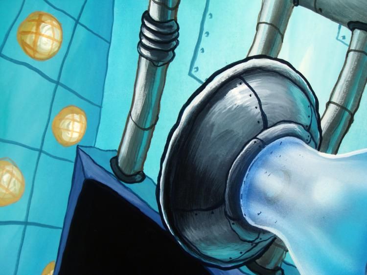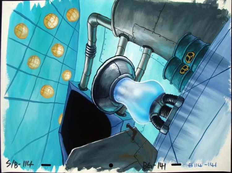 This original hand-painted background is from the Nickelodeon TVshow SpongeBob Squarepants. The story takes place under the deepblue sea in Bikini Bottom, where SpongeBob resides. SpongeBob, who is ayellow, porous sponge, is your typical happy-go-lucky character, as he isalways cheerful and enjoys making people laugh. Patrick Star, SpongeBob's neighborwho is a starfish, is your average children's show idiot, as he boasts knowingnothing and is often getting himself into ridiculous situations. Between thehomes of these two lies the home of the miserable Squidward, a squid, who isknown for being grouchy and playing tricks on SpongeBob and Patrick. BothSpongeBob and Squidward work at the Krusty Krab, a fast food business run bythe greedy money-loving Mr. Krabs, a crab, the arch rival of the evil, possiblymisunderstood, Plankton. Another neighbor, Sandy Cheeks, an athletic squirrelwho normally wears an astronaut's space suit, was introduced in "Tea atthe Treedome." She spends most of her time inventing and experimenting. * KEEP OUT!!! * * Original Production Background Overall Size of Background: 10 1/2" x 14" Very good condition; it has been stored Original Production Backgrounds are used in the making of the final versionof animated productions. The background establishes the location and theoverall good mood of the scenee. Typically, a background layout artistcreates a drawing to establish the content of the scene, placement ofcharacters, perspective and camera angle. Based on this drawing, thebackground artist creates a preliminary painting to confirm all of the scenesdetails, then the final production background which is used in the filming ofthe scene. When these backgrounds are individually photographed behindthe progression of production cels, and projected at a rapid succession, theimages in the foreground appear to move, creating an animated scene. * The background is ready to be matted and framed. It is acolored background with the animator's notations atthe bottom. *