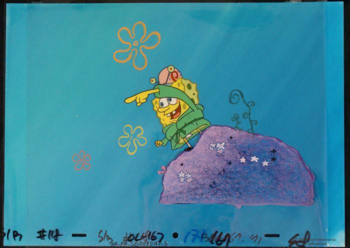 This original hand-painted background and animation cel is from the Nickelodeon TV show SpongeBob Squarepants. The story takes place under the deep blue sea in Bikini Bottom, where SpongeBob resides. SpongeBob, who is a yellow, porous sponge, is your typical happy-go-lucky character, as he is always cheerful and enjoys making people laugh. Patrick Star, SpongeBob's neighbor who is a starfish, is your average children's show idiot, as he boasts knowing nothing and is often getting himself into ridiculous situations. Between the homes of these two lies the home of the miserable Squidward, a squid, who is known for being grouchy and playing tricks on SpongeBob and Patrick. Both SpongeBob and Squidward work at the Krusty Krab, a fast food business run by the greedy money-loving Mr. Krabs, a crab, the arch rival of the evil, possibly misunderstood, Plankton. Another neighbor, Sandy Cheeks, an athletic squirrel who normally wears an astronaut's space suit, was introduced in "Tea at the Treedome." She spends most of her time inventing and experimenting. Hey, chceck this out! Yeah, it's over there...Original Production Background and Animated Cel Overall Size of Background: 13 1/2" x 17 3/4" Overall Size of the Cels: 10 1/2" x 14" Excellent ConditionThis is an original hand-painted cel set-up used in the production of an episode of "SpongeBob SquarePants." Each one-of-a-kind set-up represents a slight change in position of the characters. When individually photographed and projected in rapid succession, the images appear to move.