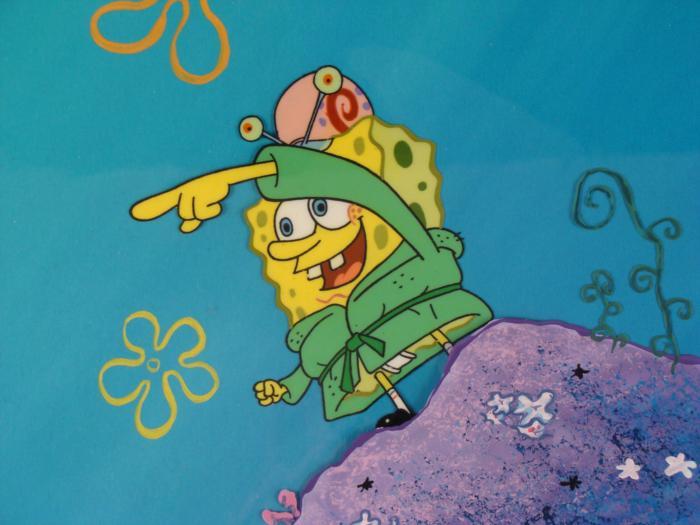 This original hand-painted background and animation cel is from the Nickelodeon TV show SpongeBob Squarepants. The story takes place under the deep blue sea in Bikini Bottom, where SpongeBob resides. SpongeBob, who is a yellow, porous sponge, is your typical happy-go-lucky character, as he is always cheerful and enjoys making people laugh. Patrick Star, SpongeBob's neighbor who is a starfish, is your average children's show idiot, as he boasts knowing nothing and is often getting himself into ridiculous situations. Between the homes of these two lies the home of the miserable Squidward, a squid, who is known for being grouchy and playing tricks on SpongeBob and Patrick. Both SpongeBob and Squidward work at the Krusty Krab, a fast food business run by the greedy money-loving Mr. Krabs, a crab, the arch rival of the evil, possibly misunderstood, Plankton. Another neighbor, Sandy Cheeks, an athletic squirrel who normally wears an astronaut's space suit, was introduced in "Tea at the Treedome." She spends most of her time inventing and experimenting. Hey, chceck this out! Yeah, it's over there...Original Production Background and Animated Cel Overall Size of Background: 13 1/2" x 17 3/4" Overall Size of the Cels: 10 1/2" x 14" Excellent ConditionThis is an original hand-painted cel set-up used in the production of an episode of "SpongeBob SquarePants." Each one-of-a-kind set-up represents a slight change in position of the characters. When individually photographed and projected in rapid succession, the images appear to move.