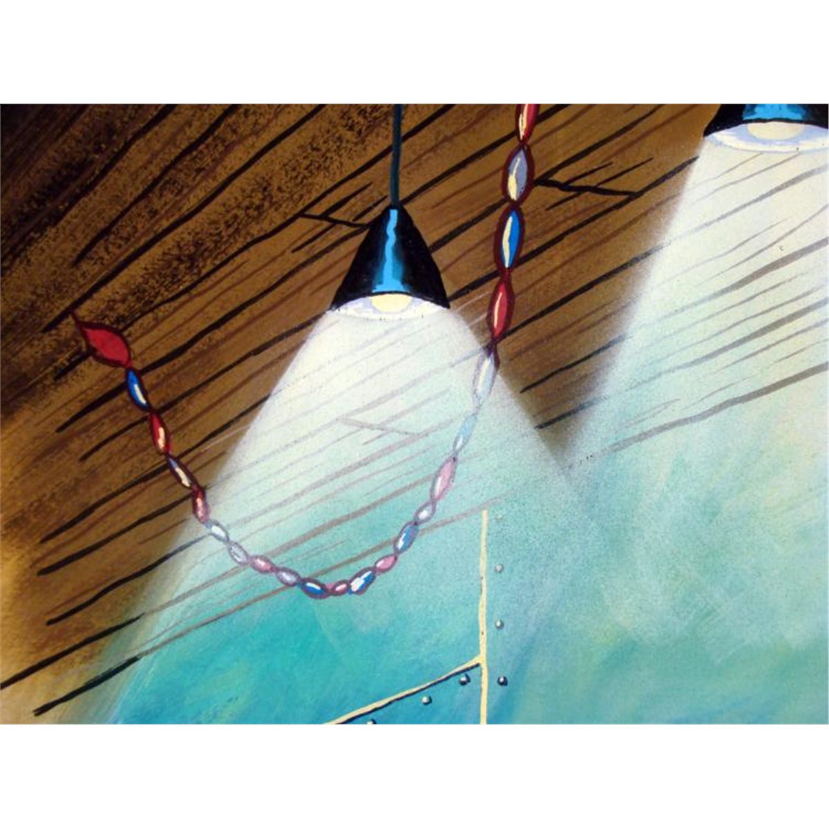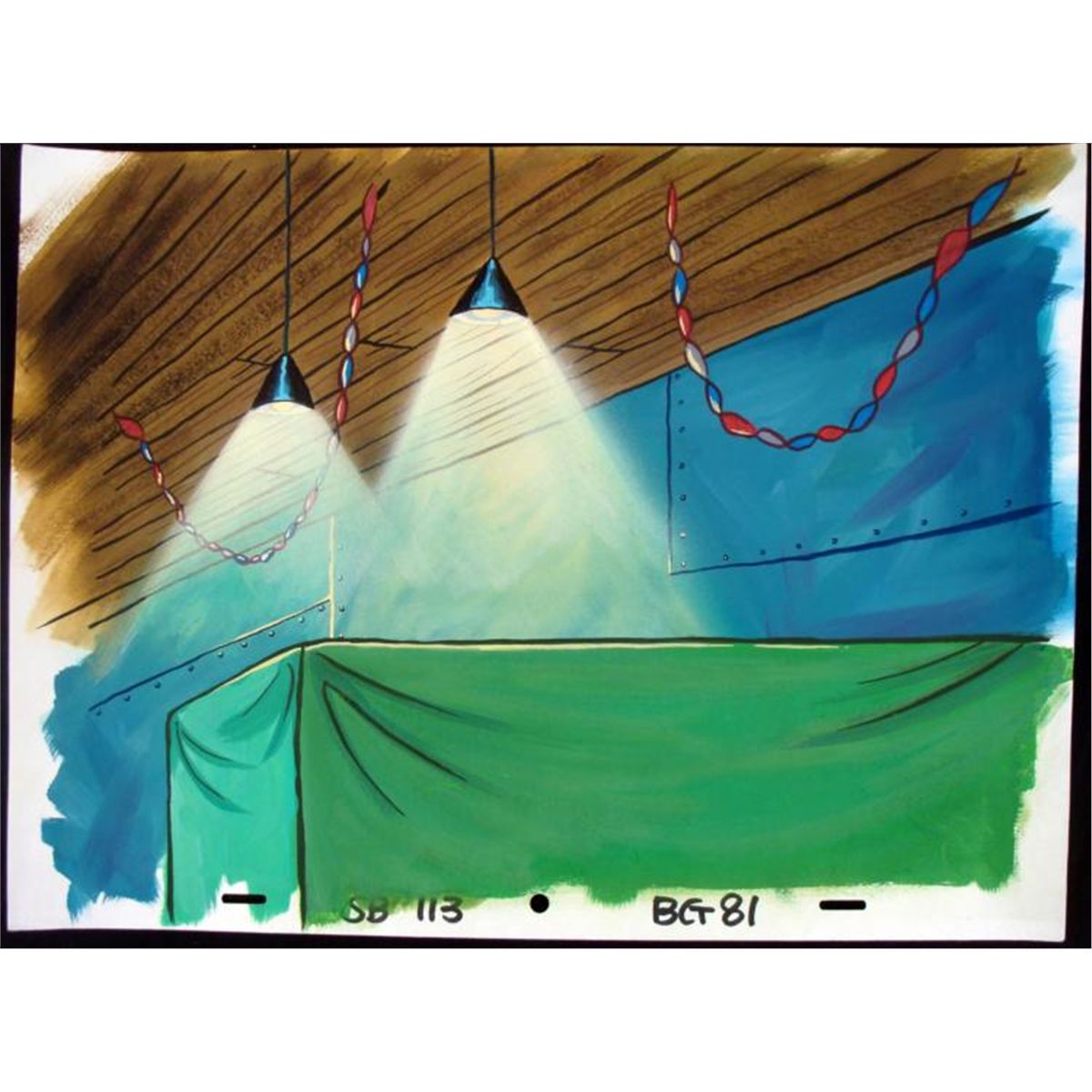 Normal 0 false false false MicrosoftInternetExplorer4 /* Style Definitions */ table.MsoNormalTable{mso-style-name:"Table Normal";mso-tstyle-rowband-size:0;mso-tstyle-colband-size:0;mso-style-noshow:yes;mso-style-parent:"";mso-padding-alt:0in 5.4pt 0in 5.4pt;mso-para-margin:0in;mso-para-margin-bottom:.0001pt;mso-pagination:widow-orphan;font-size:10.0pt;font-family:"Times New Roman";mso-ansi-language:#0400;mso-fareast-language:#0400;mso-bidi-language:#0400;}This original hand-painted background is from the Nickelodeon TVs how SpongeBob Squarepants. The story takes place under the deep blue sea in Bikini Bottom, where SpongeBob resides. SpongeBob, who is a yellow, porous sponge, is your typical happy-go-lucky character, as he is always cheerful and enjoys making people laugh. Patrick Star, SpongeBob's neighbor who is a starfish, boasts knowing nothing and is often getting himself into ridiculous situations. Between the homes of these two lies the home of the miserable Squidward, a squid, who is known for being grouchy and playing tricks on SpongeBob and Patrick. BothSpongeBob and Squidward work at the Krusty Krab, a fast food business run by the greedy money-loving Mr. Krabs, a crab, the arch rival of the evil, possibly misunderstood, Plankton. Another neighbor, Sandy Cheeks, an athletic squirrel who normally wears an astronaut's space suit, was introduced in "Tea at the Treedome." She spends most of her time inventing and experimenting. * It's party time at the Krusty Krab. * * Original Production Background Overall Size of Background: 10 1/4" x 14" Very good conditionOriginal Production Backgrounds are used in the making of the final version of animated productions. The background establishes the location and the overall good mood of the scene. Typically, a background layout artist creates a drawing to establish the content of the scene, placement of characters, perspective and camera angle. Based on this drawing, the background artist creates a preliminary painting to confirm all of the scenes details, then the final production background which is used in the filming of the scene. When these backgrounds are individually photographed behind the progression of production cels, and projected at a rapid succession, the images in the foreground appear to move, creating an animated scene. * The background is ready to be matted and framed. The bottom of the sheet has peg holes, and the animator's notations. *