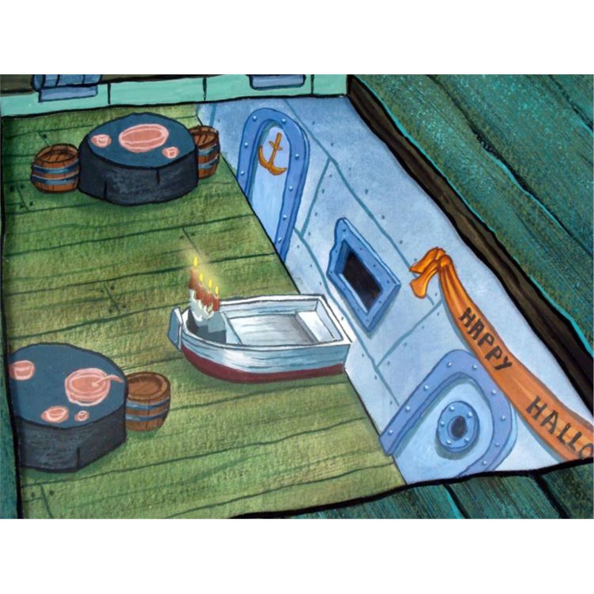 Normal 0 false false false MicrosoftInternetExplorer4 /* Style Definitions */ table.MsoNormalTable{mso-style-name:"Table Normal";mso-tstyle-rowband-size:0;mso-tstyle-colband-size:0;mso-style-noshow:yes;mso-style-parent:"";mso-padding-alt:0in 5.4pt 0in 5.4pt;mso-para-margin:0in;mso-para-margin-bottom:.0001pt;mso-pagination:widow-orphan;font-size:10.0pt;font-family:"Times New Roman";mso-ansi-language:#0400;mso-fareast-language:#0400;mso-bidi-language:#0400;}This original hand-painted cel and double background is from the Nickelodeon TVs how SpongeBob Squarepants. The story takes place under the deep blue sea in Bikini Bottom, where SpongeBob resides. SpongeBob, who is a yellow, porous sponge, is your typical happy-go-lucky character, as he is always cheerful and enjoys making people laugh. Patrick Star, SpongeBob's neighbor who is a starfish, boasts knowing nothing and is often getting himself into ridiculous situations. Between the homes of these two lies the home of the miserable Squidward, a squid, who is known for being grouchy and playing tricks on SpongeBob and Patrick. Both SpongeBob and Squidward work at the Krusty Krab, a fast food business run by the greedy money-loving Mr. Krabs, a crab, the arch rival of the evil, possibly misunderstood, Plankton. Another neighbor, Sandy Cheeks, an athletic squirrel who normally wears an astronaut's space suit, was introduced in "Tea at the Treedome." She spends most of her time inventing and experimenting. * Here is an unusual view of the Krusty Krab -through a hatch on the roof looking down. * * Original Production Background Overall Size of Background: 10 1/4" x 12 1/2", and 10 1/4" x14" Overall size of cel: 10 1/4" x 12 1/2"Very good conditionOriginal Production Backgrounds are used in the making of the final version of animated productions. The background establishes the location and the overall good mood of the scene. Typically, a background layout artist creates a drawing to establish the content of the scene, placement of characters, perspective and camera angle. Based on this drawing, the background artist creates a preliminary painting to confirm all of the scenes details, then the final production background which is used in the filming of the scene. When these backgrounds are individually photographed behind the progression of production cels, and projected at a rapid succession, the images in the foreground appear to move, creating an animated scene. * The background has two layers, with cut-out portion for the hatch, and includes a cel which has the candle flames. The bottom of the sheet has peg holes, and the animator's notations. *
