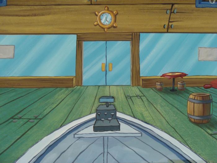 This original hand-painted background and animation cel are from the Nickelodeon TV show SpongeBob Squarepants. The story takes place under the deep blue sea in Bikini Bottom, where SpongeBob resides. SpongeBob, who is a yellow, porous sponge, is your typical happy-go-lucky character, as he is always cheerful and enjoys making people laugh. Patrick Star, SpongeBob's neighbor, is a starfish who boasts knowing nothing and is often getting himself into ridiculous situations. Between the homes of these two lies the home of the miserable Squidward, a squid, who is known for being grouchy and playing tricks on SpongeBob and Patrick. Both SpongeBob and Squidward work at the Krusty Krab, a fast food business run by the greedy money-loving Mr. Krabs, a crab, the arch rival of the evil, possibly misunderstood, Plankton. Another neighbor, Sandy Cheeks, an athletic squirrel who normally wears an astronaut's space suit, was introduced in "Tea at the Treedome." She spends most of her time inventing and experimenting. This is the view Squidward has when he is taking order at the Krusty Krab.Original Production Background and Animated Cel Overall Size of Background: 10 1/2" x 13 1/2" Overall Size of the Cel: 10" x 12 1/2" Very good condition; it has been stored This is an original hand-painted cel set-up used in the production of an episode of "SpongeBob SquarePants." Each one-of-a-kind set-up represents a slight change in position of the characters. When individually photographed and projected in rapid succession, the images appear to move.