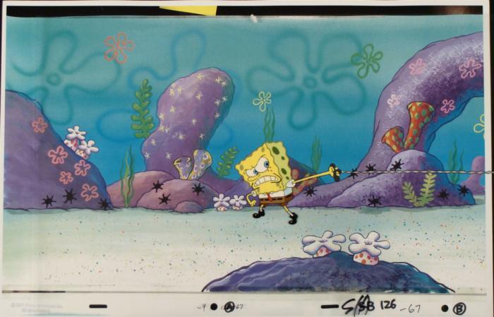 To create production cels, the original animator's drawing is transferred onto an acetate cel (by hand-inking and/or photo copying). The cel is then hand-painted on the reverse side. The background accompanying this set-up is a reproduction background. The printed background is ready to be matted and framed. The notations are located at the bottom of both. There is some slight paint fade to Spongebob's outline.