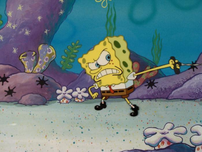 This animation cel and reproduction background are from the Nickelodeon TV show SpongeBob Squarepants. The story takes place under the deep blue sea in Bikini Bottom, where SpongeBob resides. SpongeBob, who is a yellow, porous sponge, is your typical happy-go-lucky character, as he is always cheerful and enjoys making people laugh. Patrick Star, SpongeBob's neighbor who is a starfish, is your average children's show idiot, as he boasts knowing nothing and is often getting himself into ridiculous situations. Between the homes of these two lies the home of the miserable Squidward, a squid, who is known for being grouchy and playing tricks on SpongeBob and Patrick. Both SpongeBob and Squidward work at the Krusty Krab, a fast food business run by the greedy money-loving Mr. Krabs, a crab, the arch rival of the evil, possibly misunderstood, Plankton. Another neighbor, Sandy Cheeks, an athletic squirrel who normally wears an astronaut's space suit, was introduced in "Tea at the Treedome." She spends most of her time inventing and experimenting. This stupid thing isn't moving!!Original Printed Background and Animated Cel Overall Size of Background: 11" x 17" Overall Size of the Cel: 10 1/2" x 16 1/2" Very good condition This is an original hand-painted cel set-up used in the production of an episode of "SpongeBob SquarePants." Each one-of-a-kind set-up represents a slight change in position of the characters. When individually photographed and projected in rapid succession, the images appear to move.