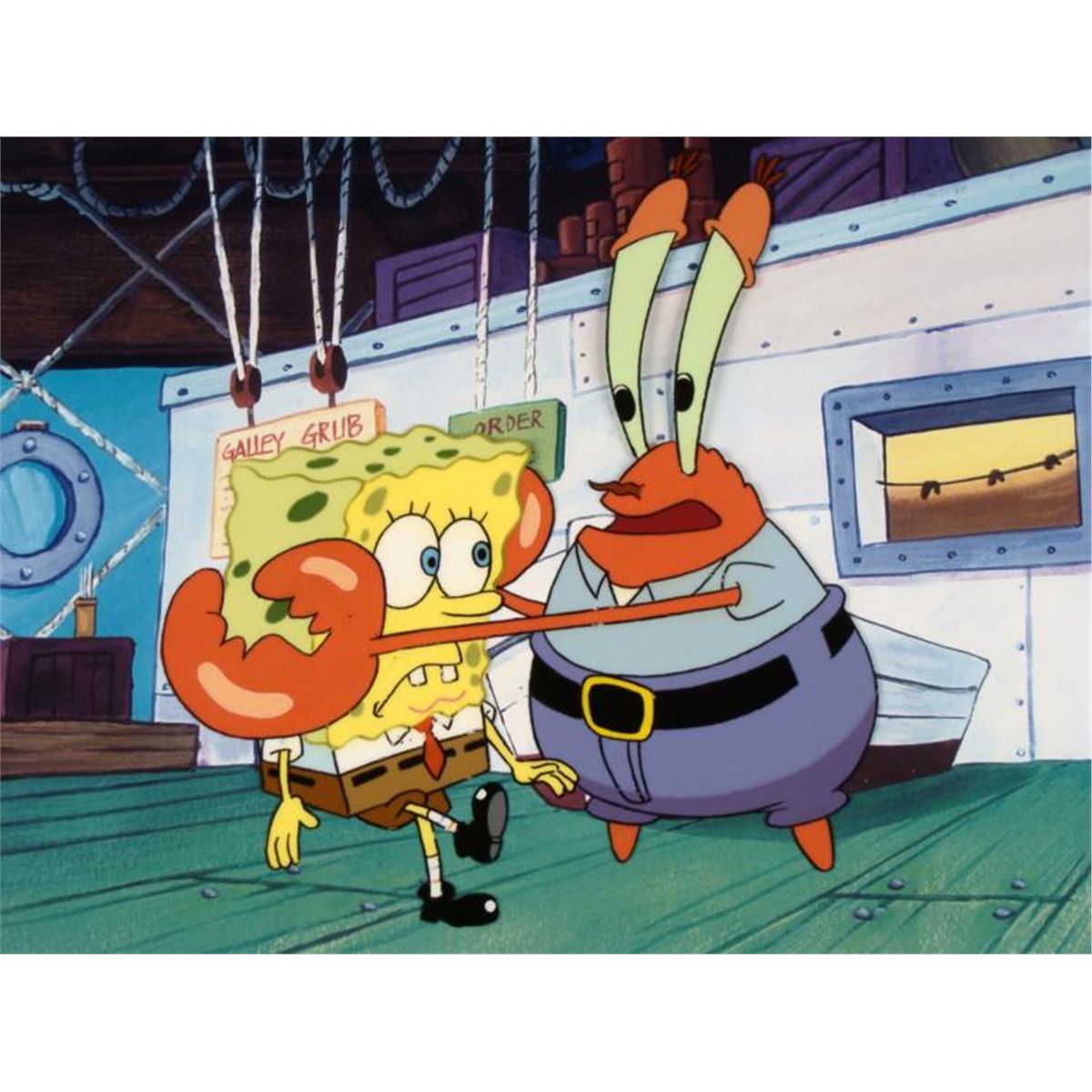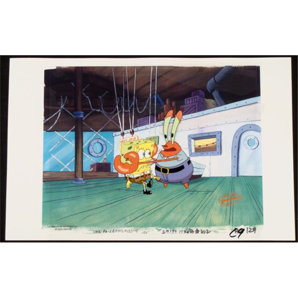 This animation cel and reproduction background are from the Nickelodeon TV show SpongeBob Squarepants. The story takes place under the deep blue sea in Bikini Bottom, where SpongeBob resides. SpongeBob, who is a yellow, porous sponge, is your typical happy-go-lucky character, as he is always cheerful and enjoys making people laugh. Patrick Star, SpongeBob's neighbor who is a starfish, is your average children's show idiot, as he boasts knowing nothing and is often getting himself into ridiculous situations.Between the homes of these two lies the home of the miserable Squidward, a squid, who is known for being grouchy and playing tricks on SpongeBob and Patrick. Both SpongeBob and Squidward work at the Krusty Krab, a fast food business run by the greedy money-loving Mr. Krabs, a crab, the arch rival of the evil, possibly misunderstood, Plankton. Another neighbor, Sandy Cheeks, an athletic squirrel who normally wears an astronaut's space suit, was introduced in "Tea at the Treedome." She spends most of her time inventing and experimenting. * * What did you do SPONGEBOB, WHAT DID YOU DO!!! * * Original Printed Background and Animated Cel Overall Size of Background: 11" x 17" Overall Size of the Cel: 10 1/2" x 12 1/2" Very good condition This is an original hand-painted cel set-up used in the production of an episode of "SpongeBob SquarePants," titled Squeaky Boots. Each one-of-a-kind set-up represents a slight change in position of the characters. When individually photographed and projected in rapid succession, the images appear to move. * To create production cels, the original animator's drawing is transferred onto an acetate cel (by hand-inking and/or photo copying). The cel is then hand-painted on the reverse side. The background accompanying this set-upis a reproduction background. * * The printed background and cel are ready to be matted and framed. The notations are located at the bottom of both. The Nickelodeon logo is located at the bottom right of the cel. There is some slight paint fade to Mr. Krabs and Spongebob's outline. *