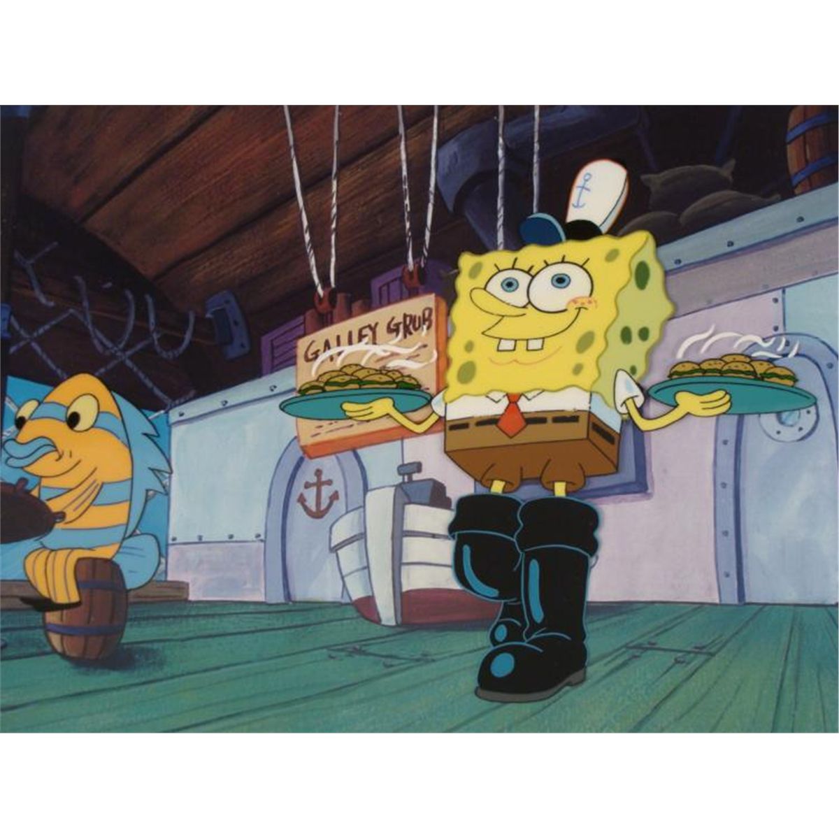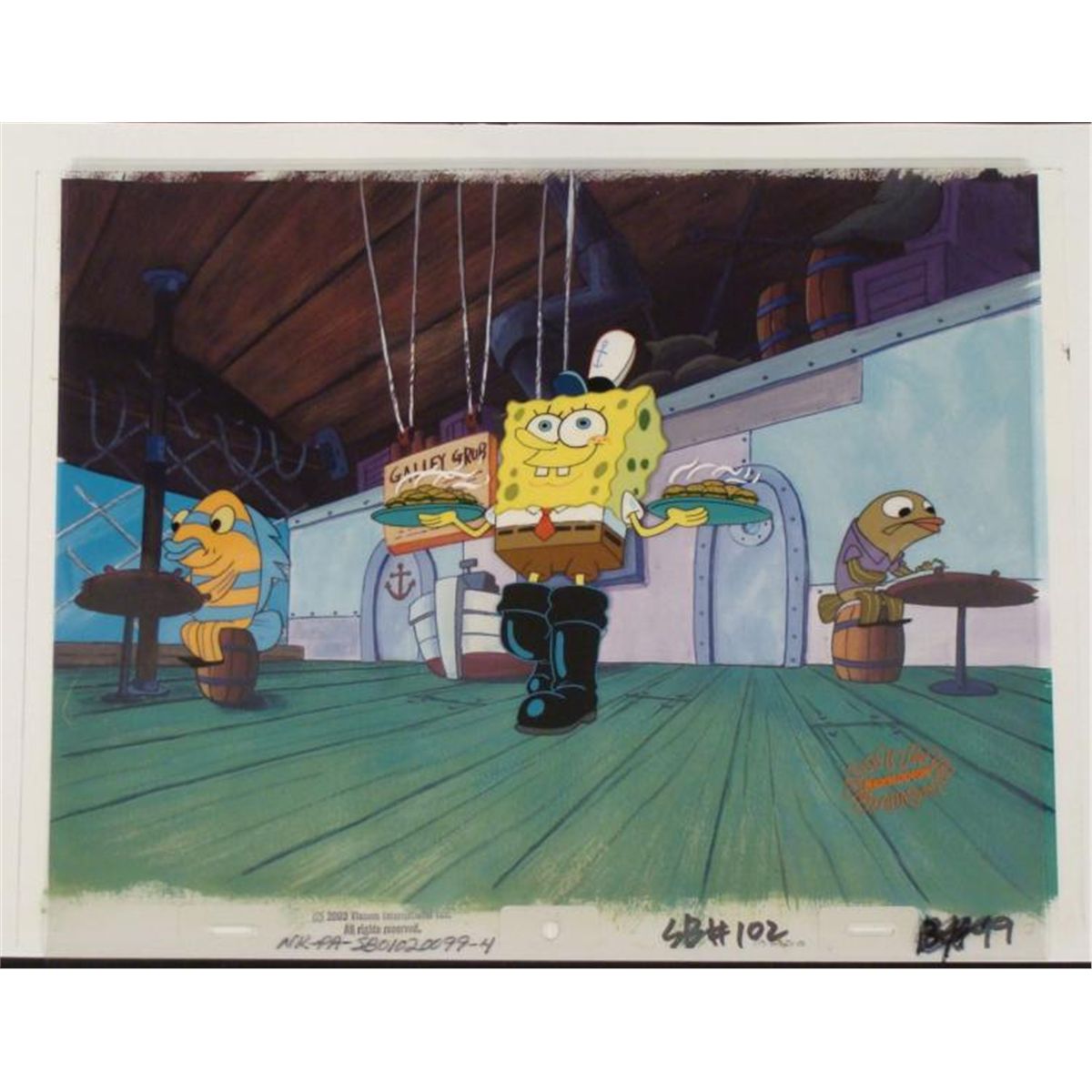This animation cel and reproduction background are from the Nickelodeon TV show SpongeBob Squarepants. The story takes place under the deep blue sea in Bikini Bottom, where SpongeBob resides. SpongeBob, who is a yellow, porous sponge, is your typical happy-go-lucky character, as he is always cheerful and enjoys making people laugh. Patrick Star, SpongeBob's neighbor who is a starfish, is your average children's show idiot, as he boasts knowing nothing and is often getting himself into ridiculous situations.Between the homes of these two lies the home of the miserable Squidward, a squid, who is known for being grouchy and playing tricks on SpongeBob and Patrick. Both SpongeBob and Squidward work at the Krusty Krab, a fast food business run by the greedy money-loving Mr. Krabs, a crab, the arch rival of the evil, possibly misunderstood, Plankton. Another neighbor, Sandy Cheeks, an athletic squirrel who normally wears an astronaut's space suit, was introduced in "Tea at the Treedome." She spends most of her time inventing and experimenting. * The best part of this job is serving the irresistible Krabby Patties... * * Original Printed Background and Animated Cel Overall Size of Background: 11" x 17" Overall Size of the Cel: 10 1/2" x 12 1/2" Very good condition This is an original hand-painted cel set-up used in the production of an episode of "SpongeBob SquarePants", titled Squeaky Boots. Each one-of-a-kind set-up represents a slight change in position of the characters. When individuallyp hotographed and projected in rapid succession, the images appear to move. * To create production cels, the original animator's drawing is transferred onto an acetate cel (by hand-inking and/or photo copying). The cel is then hand-painted on the reverse side. The background accompanying this set-up is a reproduction background. * The printed background and cel are ready to be matted and framed. The notations are located at the bottom of both. The cel is multi-layered: first is the steam from the Krabby Patties, then is Spongebob, followed by two fishes waiting for their food. The Nickelodeon logo is located at the bottom right of the second cel. There is some paint fade to Spongebob's and two fishes outline. *