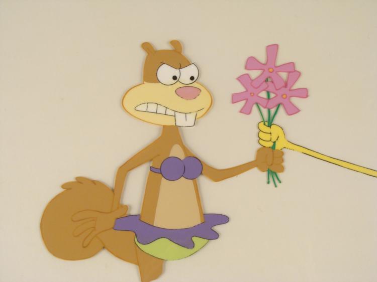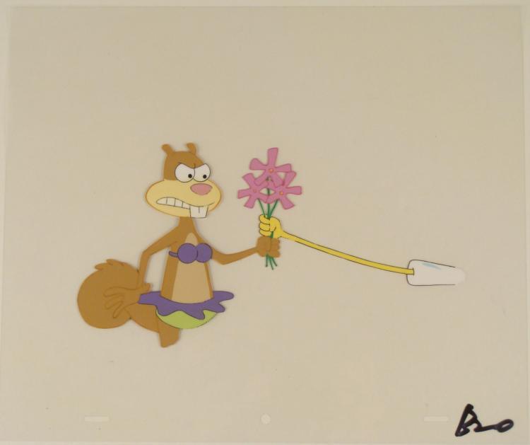 This original animation cel is from the Nickelodeon TV show SpongeBob Squarepants. The story takes place under the deep blue sea in Bikini Bottom, where SpongeBob resides. SpongeBob, who is a yellow, porous sponge, is your typical happy-go-lucky character, as he is always cheerful and enjoys making people laugh. Patrick Star, SpongeBob's neighbor who is a starfish, is your average children's show idiot, as he boasts knowing nothing and is often getting himself into ridiculous situations. Between the homes of these two lies the home of the miserable Squidward, a squid, who is known for being grouchy and playing tricks on SpongeBob and Patrick. Both SpongeBob and Squidward work at the Krusty Krab, a fast food business run by the greedy money-loving Mr. Krabs, a crab, the arch rival of the evil, possibly misunderstood, Plankton. Another neighbor, Sandy Cheeks, an athletic squirrel who normally wears an astronaut's space suit, was introduced in "Tea at the Treedome." She spends most of her time inventing and experimenting. * I mean it Spongebob, those flowers are MINE!!! * Original Production Animated Cel Overall Size of Cel: 10 1/2" x 12 1/2" Very Good Condition This is an original hand-painted cel set-up used in the production of an episode of "SpongeBob SquarePants." Each one-of-a-kind set-up represents a slight change in position of the characters. When individually photographed and projected in rapid succession, the images appear to move. * To create production cels, the original animator's drawing is transferred onto an acetate cel (by hand-inking and/or photo copying). The cel is then hand-painted on the reverse side. * The cel received by the winning bidder may be ever so slightly different from the one in the auction photos. * The cel is ready to be matted and framed. The animator's notations are at the bottom of the cel. There is some slight paint fade to Sandy's and Spongebob's arm outline. *