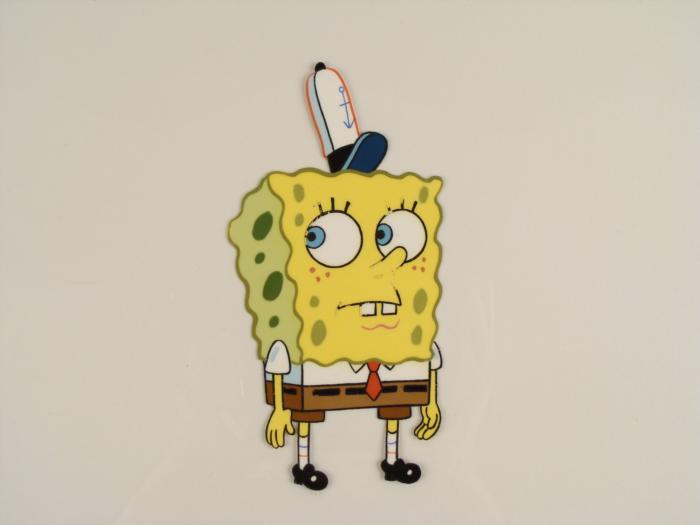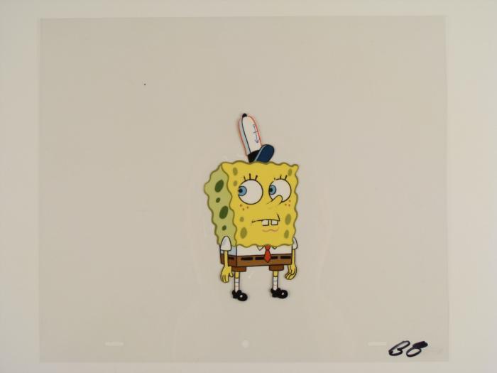 This original animation cel is from the Nickelodeon TV show SpongeBob Squarepants. The story takes place under the deep blue sea in Bikini Bottom, where SpongeBob resides. SpongeBob, who is a yellow, porous sponge, is your typical happy-go-lucky character, as he is always cheerful and enjoys making people laugh. Patrick Star, SpongeBob's neighbor who is a starfish, is your average children's show idiot, as he boasts knowing nothing and is often getting himself into ridiculous situations. Between the homes of these two lies the home of the miserable Squidward, a squid, who is known for being grouchy and playing tricks on SpongeBob and Patrick. Both SpongeBob and Squidward work at the Krusty Krab, a fast food business run by the greedy money-loving Mr. Krabs, a crab, the arch rival of the evil, possibly misunderstood, Plankton. Another neighbor, Sandy Cheeks, an athletic squirrel who normally wears an astronaut's space suit, was introduced in "Tea at the Treedome." She spends most of her time inventing and experimenting. In this cel, Spongebob seems to have a look of uncertainty, shifting his focus on what might be occurring behind him.Original Production Animated Cel Overall Size of Cel: 10 1/2" x 12 1/2" Very Good Condition; slight wear on the outlinesThis is an original hand-painted cel set-up used in the production of an episode of "SpongeBob SquarePants." Each one-of-a-kind set-up represents a slight change in position of the characters. When individually photographed and projected in rapid succession, the images appear to move.