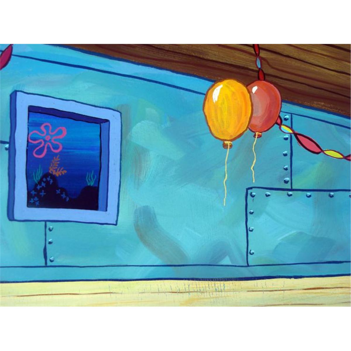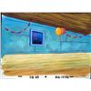 Normal 0 false false false MicrosoftInternetExplorer4 This original hand-painted background is from the Nickelodeon TVs how SpongeBob Squarepants. The story takes place under the deep blue sea in Bikini Bottom, where SpongeBob resides. SpongeBob, who is a yellow, porous sponge, is your typical happy-go-lucky character, as he is always cheerful and enjoys making people laugh. Patrick Star, SpongeBob's neighbor who is a starfish, boasts knowing nothing and is often getting himself into ridiculous situations. Between the homes of these two lies the home of the miserable Squidward, a squid, who is known for being grouchy and playing tricks on SpongeBob and Patrick. Both SpongeBob and Squidward work at the Krusty Krab, a fast food business run by the greedy money-loving Mr. Krabs, a crab, the arch rival of the evil, possibly misunderstood, Plankton. Another neighbor, Sandy Cheeks, an athletic squirrel who normally wears an astronaut's space suit, was introduced in "Tea at the Treedome." She spends most of her time inventing and experimenting.The Krusty Krab is all decorated with balloons for a party. * * Original Production Background Overall Size of Background: 10 1/2" x 14" Very good conditionOriginal Production Backgrounds are used in the making of the final version of animated productions. The background establishes the location and the overall good mood of the scene. Typically, a background layout artist creates a drawing to establish the content of the scene, placement of characters, perspective and camera angle. Based on this drawing, the background artist creates a preliminary painting to confirm all of the scenes details, then the final production background which is used in the filming of the scene. When these backgrounds are individually photographed behind the progression of production cels, and projected at a rapid succession, the images in the foreground appear to move, creating an animated scene. * The bottom of the sheet has peg holes, and the animator's notations. *