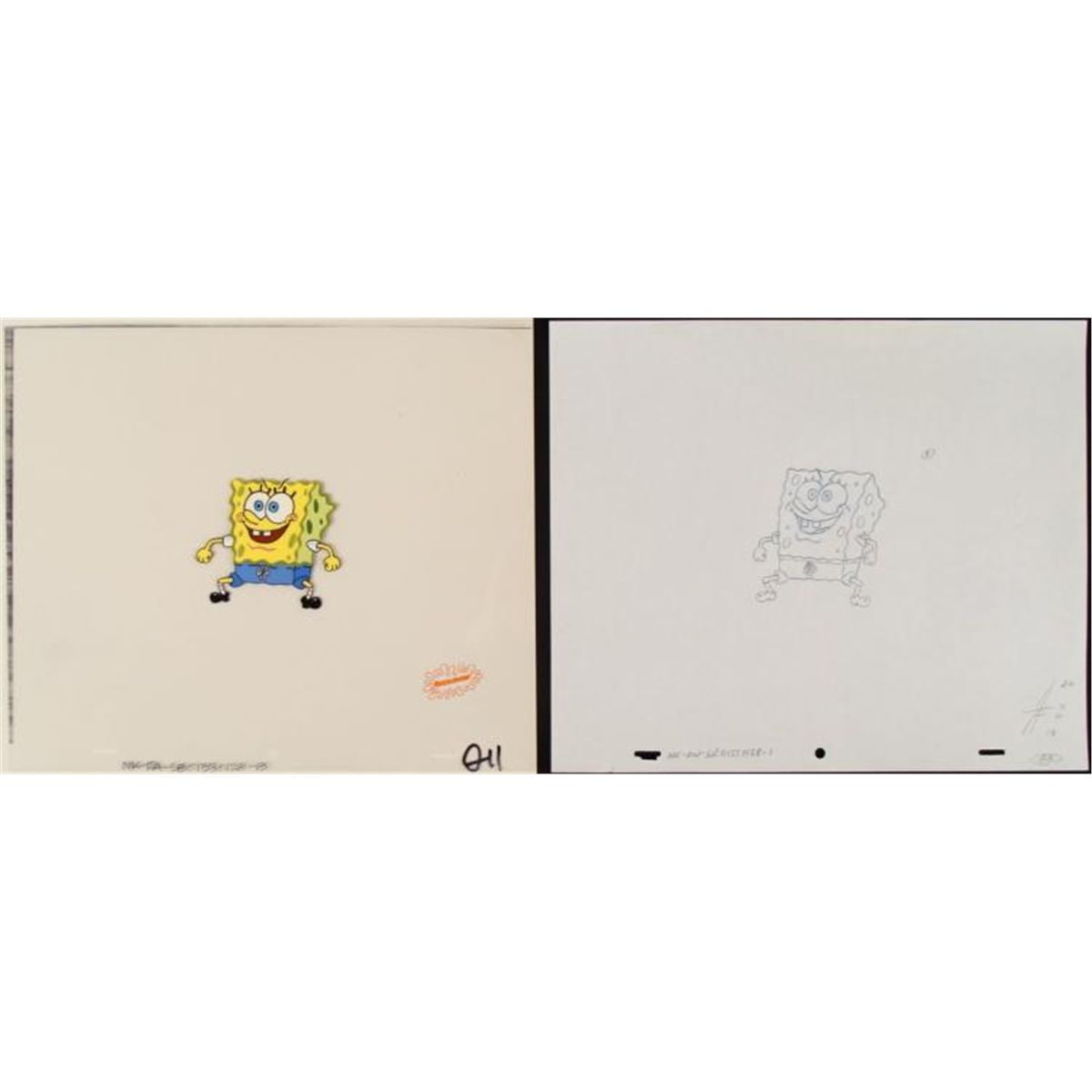 This original hand-painted animation cel with matching drawing is from the Nickelodeon TVs how SpongeBob Squarepants. The story takes place under the deep blue sea in Bikini Bottom, where SpongeBob resides. SpongeBob, who is a yellow, porous sponge, is your typical happy-go-lucky character, as he is always cheerful and enjoys making people laugh. Patrick Star, SpongeBob's neighbor who is a starfish, boasts knowing nothing and is often getting himself into ridiculous situations. Between the homes of these two lies the home of the miserable Squidward, a squid, who is known for being grouchy and playing tricks on SpongeBob and Patrick. Both SpongeBob and Squidward work at the Krusty Krab, a fast food business run by the greedy money-loving Mr. Krabs, a crab, the arch rival of the evil, possibly misunderstood, Plankton. Another neighbor, Sandy Cheeks, an athletic squirrel who normally wears an astronaut's space suit, was introduced in "Tea at the Treedome." She spends most of her time inventing and experimenting. * SpongeBob is hopping in the air, possibly in a volleyball move. * * Original Production Background Overall Size of cel and drawing: 10 1/2" x 12 1/2" Very good condition; drawing has some creasesEach one-of-a-kind set-up represents a slight change in position of the characters. When individually photographed and projected in rapid succession, the images appear to move. * To create production cels, the original animator's drawing is transferred onto an acetate cel (by hand-inking and/or photo copying). The cel is then hand-painted on the reverse side. * The bottom of the sheet has Nickelodeon mark, peg holes, and the animator's notations. *