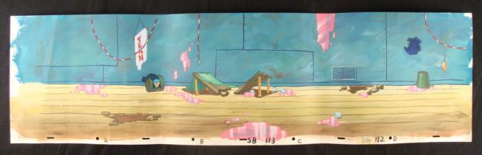 This original hand-painted background from the Nickelodeon TV show SpongeBob Squarepants. The story takes place under the deep blue sea in Bikini Bottom, where SpongeBob resides. SpongeBob, who is a yellow, porous sponge, is your typical happy-go-lucky character, as he is always cheerful and enjoys making people laugh. Patrick Star, SpongeBob's neighbor who is a starfish, is your average children's show idiot, as he boasts knowing nothing and is often getting himself into ridiculous situations. Between the homes of these two lies the home of the miserable Squidward, a squid, who is known for being grouchy and playing tricks on SpongeBob and Patrick. Both SpongeBob and Squidward work at the Krusty Krab, a fast food business run by the greedy money-loving Mr. Krabs, a crab, the arch rival of the evil, possibly misunderstood, Plankton. Another neighbor, Sandy Cheeks, an athletic squirrel who normally wears an astronaut's space suit, was introduced in "Tea at the Treedome." She spends most of her time inventing and experimenting. Who crashed the party?Original Production Background Overall Size of Background: 10 1/2" x 37 1/4" Very good condition; it has been stored rolledOriginal Production Backgrounds are used in the making of the final version of animated productions. The background establishes the location and the overall good mood of the scene. Typically, a background layout artist creates a drawing to establish the content of the scene, placement of characters, perspective and camera angle. Based on this drawing, the background artist creates a preliminary painting to confirm all of the scenes details, then the final production background which is used in the filming of the scene. When these backgrounds are individually photographed behind the progression of production cels, and projected at a rapid succession, the images in the foreground appear to move, creating an animated scene. The background is ready to be matted and framed. It is a colored background with the animator's notations at the bottom.