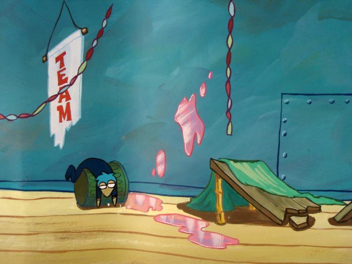 This original hand-painted background from the Nickelodeon TV show SpongeBob Squarepants. The story takes place under the deep blue sea in Bikini Bottom, where SpongeBob resides. SpongeBob, who is a yellow, porous sponge, is your typical happy-go-lucky character, as he is always cheerful and enjoys making people laugh. Patrick Star, SpongeBob's neighbor who is a starfish, is your average children's show idiot, as he boasts knowing nothing and is often getting himself into ridiculous situations. Between the homes of these two lies the home of the miserable Squidward, a squid, who is known for being grouchy and playing tricks on SpongeBob and Patrick. Both SpongeBob and Squidward work at the Krusty Krab, a fast food business run by the greedy money-loving Mr. Krabs, a crab, the arch rival of the evil, possibly misunderstood, Plankton. Another neighbor, Sandy Cheeks, an athletic squirrel who normally wears an astronaut's space suit, was introduced in "Tea at the Treedome." She spends most of her time inventing and experimenting. Who crashed the party?Original Production Background Overall Size of Background: 10 1/2" x 37 1/4" Very good condition; it has been stored rolledOriginal Production Backgrounds are used in the making of the final version of animated productions. The background establishes the location and the overall good mood of the scene. Typically, a background layout artist creates a drawing to establish the content of the scene, placement of characters, perspective and camera angle. Based on this drawing, the background artist creates a preliminary painting to confirm all of the scenes details, then the final production background which is used in the filming of the scene. When these backgrounds are individually photographed behind the progression of production cels, and projected at a rapid succession, the images in the foreground appear to move, creating an animated scene. The background is ready to be matted and framed. It is a colored background with the animator's notations at the bottom.