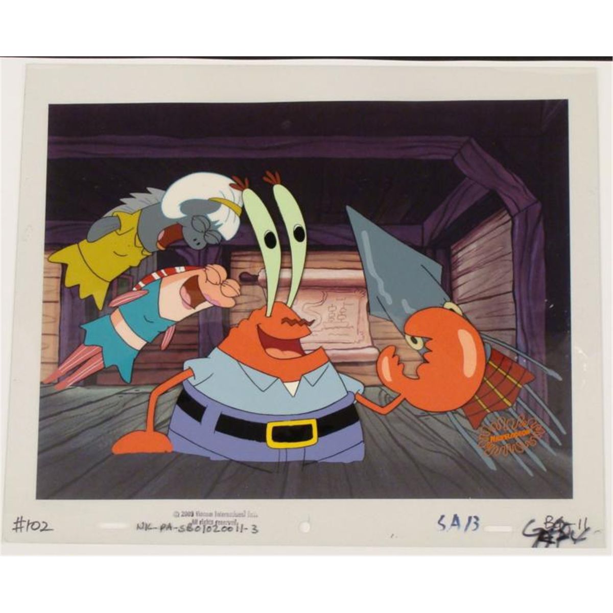 This animation cel and reproduction background are from the Nickelodeon TV show SpongeBob Squarepants. The story takes place under the deep blue sea in Bikini Bottom, where SpongeBob resides. SpongeBob, who is a yellow, porous sponge, is your typical happy-go-lucky character, as he is always cheerful and enjoys making people laugh. Patrick Star, SpongeBob's neighbor who is a starfish, is your average children's show idiot, as he boasts knowing nothing and is often getting himself into ridiculous situations.Between the homes of these two lies the home of the miserable Squidward, a squid, who is known for being grouchy and playing tricks on SpongeBob and Patrick. Both SpongeBob and Squidward work at the Krusty Krab, a fast food business run by the greedy money-loving Mr. Krabs, a crab, the arch rival of the evil, possibly misunderstood, Plankton. Another neighbor, Sandy Cheeks, an athletic squirrel who normally wears an astronaut's space suit, was introduced in "Tea at the Treedome." She spends most of her time inventing and experimenting. * I have this awesome treasure map that I wanted to show you guys... Yet none of his companions appear to be taking Krusty seriously. * * Original Printed Background and Animated Cel Overall Size of Background: 11" x 17" Overall Size of the Cel: 10 1/2" x 12 1/2" Excellent condition This is an original hand-painted cel set-up used in the production of an episode of "SpongeBob SquarePants", titled Squeaky Boots. Each one-of-a-kind set-up represents a slight change in position of the characters. When individually photographed and projected in rapid succession, the images appear to move. * To create production cels, the original animator's drawing is transferred onto an acetate cel (by hand-inking and/or photo copying). The cel is then hand-painted on the reverse side. The background accompanying this set-up is a reproduction background. * The printed background and cel are ready to be matted and framed. The notations are located at the bottom of both. The cel is multi-layered: first is Krusty, then a pink fish, and finally a gray fish and squid . The Nickelodeon logo is located at the bottom right of the first cel. * *