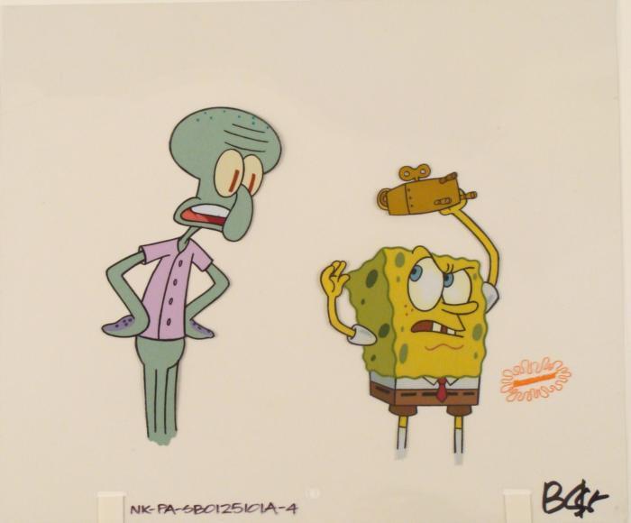 To create production cels, the original animator's drawing is transferred onto an acetate cel (by hand-inking and/or photo copying). The cel is then hand-painted on the reverse side. The cel is ready to be matted and framed. The animator's notations are at the bottom of the cel. The cel is multi-layered: first is Squidwar and next is Spongebob. There is minor paint residue on the second cel. The Nickelodeon logo is at the bottom right of the first cel.