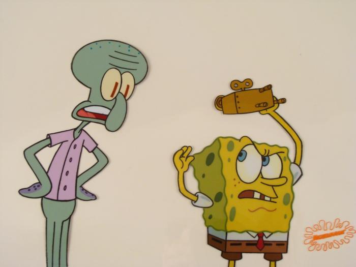 This original animation cel is from the Nickelodeon TV show SpongeBob Squarepants. The story takes place under the deep blue sea in Bikini Bottom, where SpongeBob resides. SpongeBob, who is a yellow, porous sponge, is your typical happy-go-lucky character, as he is always cheerful and enjoys making people laugh. Patrick Star, SpongeBob's neighbor who is a starfish, is your average children's show idiot, as he boasts knowing nothing and is often getting himself into ridiculous situations. Between the homes of these two lies the home of the miserable Squidward, a squid, who is known for being grouchy and playing tricks on SpongeBob and Patrick. Both SpongeBob and Squidward work at the Krusty Krab, a fast food business run by the greedy money-loving Mr. Krabs, a crab, the arch rival of the evil, possibly misunderstood, Plankton. Another neighbor, Sandy Cheeks, an athletic squirrel who normally wears an astronaut's space suit, was introduced in "Tea at the Treedome." She spends most of her time inventing and experimenting. I'm gonna do it Squidward and there is nothing you can do to stop me!!!Original Production Animated Cel Overall Size of Cel: 10 1/2" x 12 1/2" Very Good ConditionThis is an original hand-painted cel set-up used in the production of an episode of "SpongeBob SquarePants." Each one-of-a-kind set-up represents a slight change in position of the characters. When individually photographed and projected in rapid succession, the images appear to move.