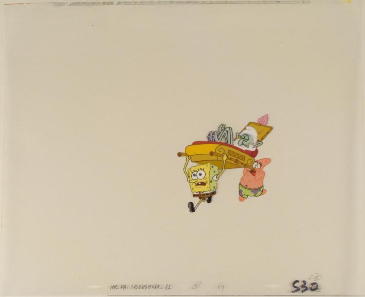 This original animation cel is from the Nickelodeon TV show SpongeBob Squarepants. The story takes place under the deep blue sea in Bikini Bottom, where SpongeBob resides. SpongeBob, who is a yellow, porous sponge, is your typical happy-go-lucky character, as he is always cheerful and enjoys making people laugh. Patrick Star, SpongeBob's neighbor who is a starfish, is your average children's show idiot, as he boasts knowing nothing and is often getting himself into ridiculous situations. Between the homes of these two lies the home of the miserable Squidward, a squid, who is known for being grouchy and playing tricks on SpongeBob and Patrick. Both SpongeBob and Squidward work at the Krusty Krab, a fast food business run by the greedy money-loving Mr. Krabs, a crab, the arch rival of the evil, possibly misunderstood, Plankton. Another neighbor, Sandy Cheeks, an athletic squirrel who normally wears an astronaut's space suit, was introduced in "Tea at the Treedome." She spends most of her time inventing and experimenting. * Patrick, get a move on it! Squidward weighs a ton!! * Original Production Animated Cel Overall Size of Cel: 13 1/2" x 18 1/2" Good Condition This is an original hand-painted cel set-up used in the production of an episode of "SpongeBob SquarePants." Each one-of-a-kind set-up represents a slight change in position of the characters. When individually photographed and projected in rapid succession, the images appear to move. * To create production cels, the original animator's drawing is transferred onto an acetate cel (by hand-inking and/or photo copying). The cel is then hand-painted on the reverse side. * The cel is ready to be matted and framed. The animator's notations are at the bottom of the cel. There is some minor paint fade to Spongebob's outline. There is a small tear near at the top left part of the cel. *