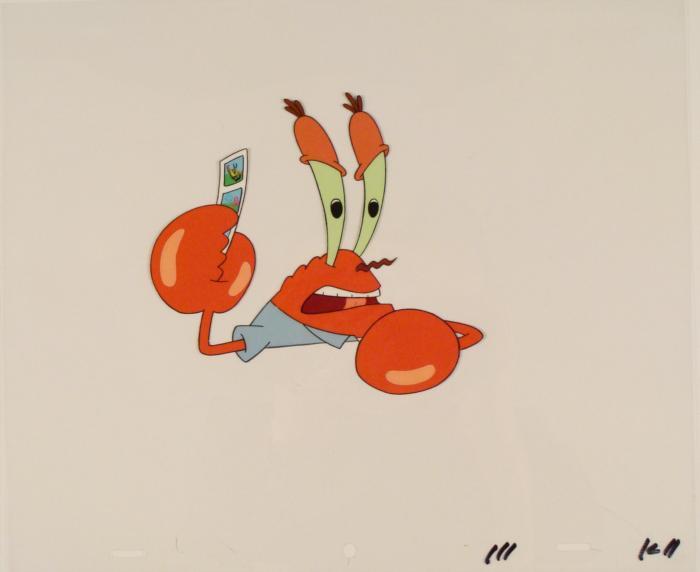This original animation cel is from the Nickelodeon TV show SpongeBob Squarepants. The story takes place under the deep blue sea in Bikini Bottom, where SpongeBob resides. SpongeBob, who is a yellow, porous sponge, is your typical happy-go-lucky character, as he is always cheerful and enjoys making people laugh. Patrick Star, SpongeBob's neighbor who is a starfish, is your average children's show idiot, as he boasts knowing nothing and is often getting himself into ridiculous situations. Between the homes of these two lies the home of the miserable Squidward, a squid, who is known for being grouchy and playing tricks on SpongeBob and Patrick. Both SpongeBob and Squidward work at the Krusty Krab, a fast food business run by the greedy money-loving Mr. Krabs, a crab, the arch rival of the evil, possibly misunderstood, Plankton. Another neighbor, Sandy Cheeks, an athletic squirrel who normally wears an astronaut's space suit, was introduced in "Tea at the Treedome." She spends most of her time inventing and experimenting. This is preposterous!!!Original Production Animated Cel Overall Size of Cel: 10 1/2" x 12 1/2" Excellent ConditionThis is an original hand-painted cel set-up used in the production of an episode of "SpongeBob SquarePants." Each one-of-a-kind set-up represents a slight change in position of the characters. When individually photographed and projected in rapid succession, the images appear to move.
