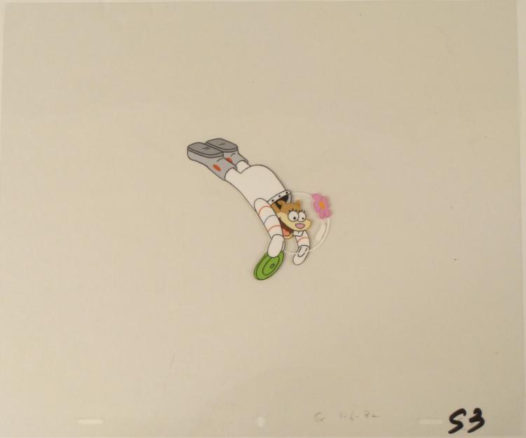 Squarepants. The story takes place under the deep blue sea in Bikini Bottom, where SpongeBob resides. SpongeBob, who is a yellow, porous sponge, is your typical happy-go-lucky character, as he is always cheerful and enjoys making people laugh. Patrick Star, SpongeBob's neighbor who is a starfish, is your average children's show idiot, as he boasts knowing nothing and is often getting himself into ridiculous situations. Between the homes of these two lies the home of the miserable Squidward, a squid, who is known for being grouchy and playing tricks on SpongeBob and Patrick. Both SpongeBob and Squidward work at the Krusty Krab, a fast food business run by the greedy money-loving Mr. Krabs, a crab, the arch rival of the evil, possibly misunderstood, Plankton. Another neighbor, Sandy Cheeks, an athletic squirrel who normally wears an astronaut's space suit, was introduced in "Tea at the Treedome." She spends most of her time inventing and experimenting. * Got it! Bet you anything I can do that again, with my eyes closed... * Original Production Animated Cel Overall Size of Cel: 10 1/2" x 12 1/2" Excellent Condition This is an original hand-painted cel set-up used in the production of an episode of "SpongeBob SquarePants." Each one-of-a-kind set-up represents a slight change in position of the characters. When individually photographed and projected in rapid succession, the images appear to move. * To create production cels, the original animator's drawing is transferred onto an acetate cel (by hand-inking and/or photo copying). The cel is then hand-painted on the reverse side. * The cel is ready to be matted and framed. The animator's notations are at the bottom of the cel. *