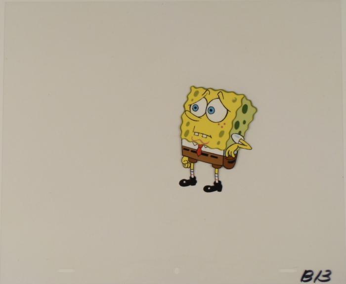 This original animation cel is from the Nickelodeon TV show SpongeBob Squarepants. The story takes place under the deep blue sea in Bikini Bottom, where SpongeBob resides. SpongeBob, who is a yellow, porous sponge, is your typical happy-go-lucky character, as he is always cheerful and enjoys making people laugh. Patrick Star, SpongeBob's neighbor who is a starfish, is your average children's show idiot, as he boasts knowing nothing and is often getting himself into ridiculous situations. Between the homes of these two lies the home of the miserable Squidward, a squid, who is known for being grouchy and playing tricks on SpongeBob and Patrick. Both SpongeBob and Squidward work at the Krusty Krab, a fast food business run by the greedy money-loving Mr. Krabs, a crab, the arch rival of the evil, possibly misunderstood, Plankton. Another neighbor, Sandy Cheeks, an athletic squirrel who normally wears an astronaut's space suit, was introduced in "Tea at the Treedome." She spends most of her time inventing and experimenting. As the saying goes: "Shot down". The look on Spongebob's face says it all.Original Production Animated Cel Overall Size of Cel: 10 1/2" x 12 1/2" Excellent ConditionThis is an original hand-painted cel set-up used in the production of an episode of "SpongeBob SquarePants." Each one-of-a-kind set-up represents a slight change in position of the characters. When individually photographed and projected in rapid succession, the images appear to move.