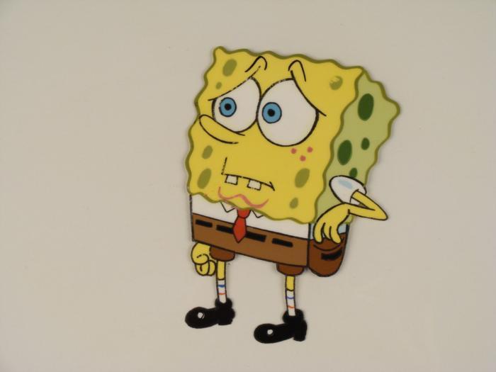 This original animation cel is from the Nickelodeon TV show SpongeBob Squarepants. The story takes place under the deep blue sea in Bikini Bottom, where SpongeBob resides. SpongeBob, who is a yellow, porous sponge, is your typical happy-go-lucky character, as he is always cheerful and enjoys making people laugh. Patrick Star, SpongeBob's neighbor who is a starfish, is your average children's show idiot, as he boasts knowing nothing and is often getting himself into ridiculous situations. Between the homes of these two lies the home of the miserable Squidward, a squid, who is known for being grouchy and playing tricks on SpongeBob and Patrick. Both SpongeBob and Squidward work at the Krusty Krab, a fast food business run by the greedy money-loving Mr. Krabs, a crab, the arch rival of the evil, possibly misunderstood, Plankton. Another neighbor, Sandy Cheeks, an athletic squirrel who normally wears an astronaut's space suit, was introduced in "Tea at the Treedome." She spends most of her time inventing and experimenting. As the saying goes: "Shot down". The look on Spongebob's face says it all.Original Production Animated Cel Overall Size of Cel: 10 1/2" x 12 1/2" Excellent ConditionThis is an original hand-painted cel set-up used in the production of an episode of "SpongeBob SquarePants." Each one-of-a-kind set-up represents a slight change in position of the characters. When individually photographed and projected in rapid succession, the images appear to move.