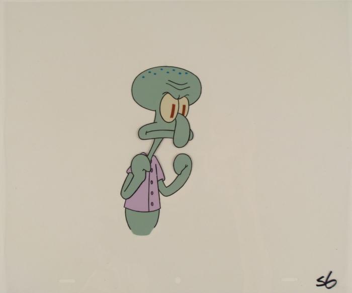 This original animation cel is from the Nickelodeon TV show SpongeBob Squarepants. The story takes place under the deep blue sea in Bikini Bottom, where SpongeBob resides. SpongeBob, who is a yellow, porous sponge, is your typical happy-go-lucky character, as he is always cheerful and enjoys making people laugh. Patrick Star, SpongeBob's neighbor who is a starfish, is your average children's show idiot, as he boasts knowing nothing and is often getting himself into ridiculous situations. Between the homes of these two lies the home of the miserable Squidward, a squid, who is known for being grouchy and playing tricks on SpongeBob and Patrick. Both SpongeBob and Squidward work at the Krusty Krab, a fast food business run by the greedy money-loving Mr. Krabs, a crab, the arch rival of the evil, possibly misunderstood, Plankton. Another neighbor, Sandy Cheeks, an athletic squirrel who normally wears an astronaut's space suit, was introduced in "Tea at the Treedome." She spends most of her time inventing and experimenting. Whose the next unlucky victim, I mean contestant, to step in the rink with Squidward?Original Production Animated Cel Overall Size of Cel: 10 1/2" x 12 1/2" Excellent ConditionThis is an original hand-painted cel set-up used in the production of an episode of "SpongeBob SquarePants." Each one-of-a-kind set-up represents a slight change in position of the characters. When individually photographed and projected in rapid succession, the images appear to move.