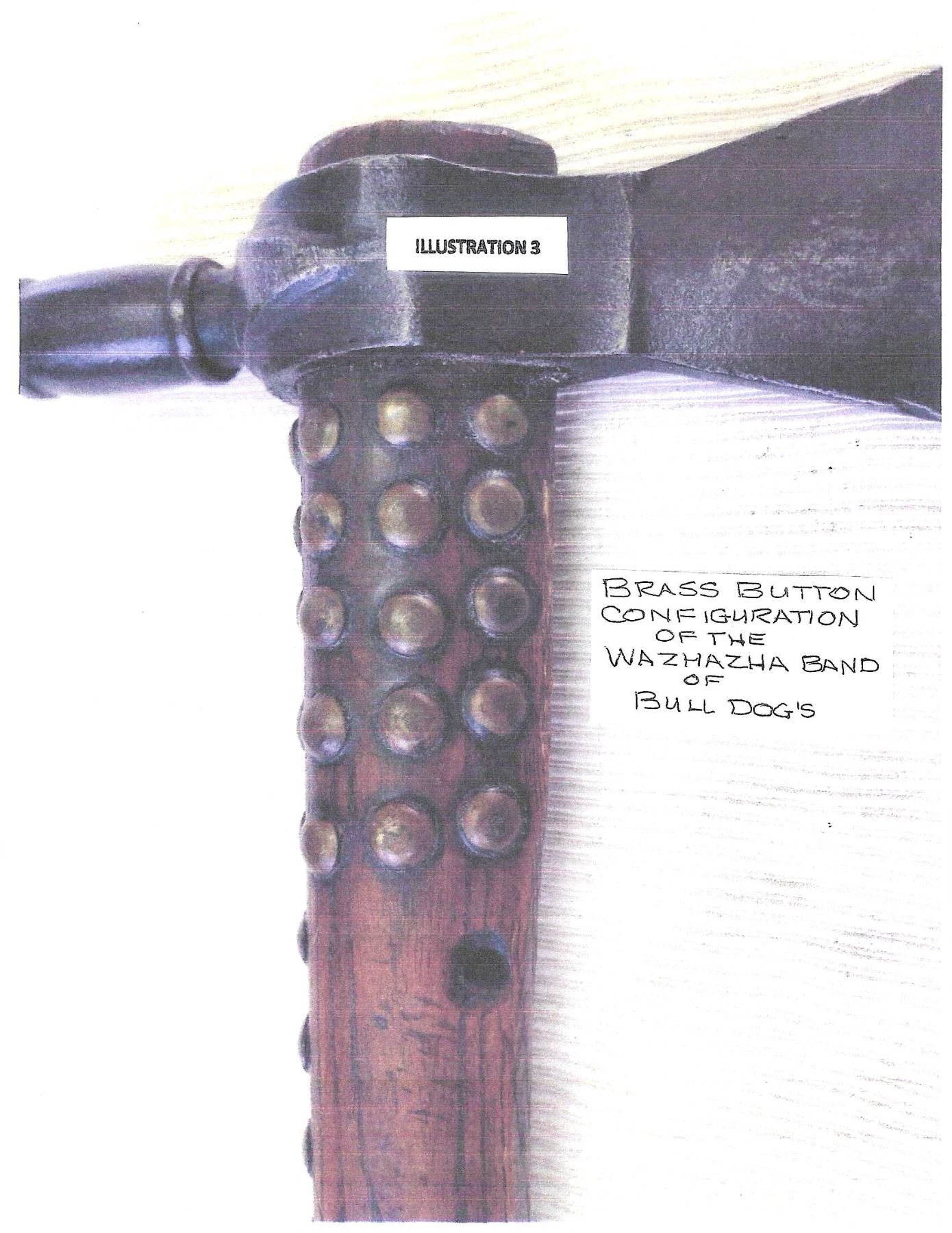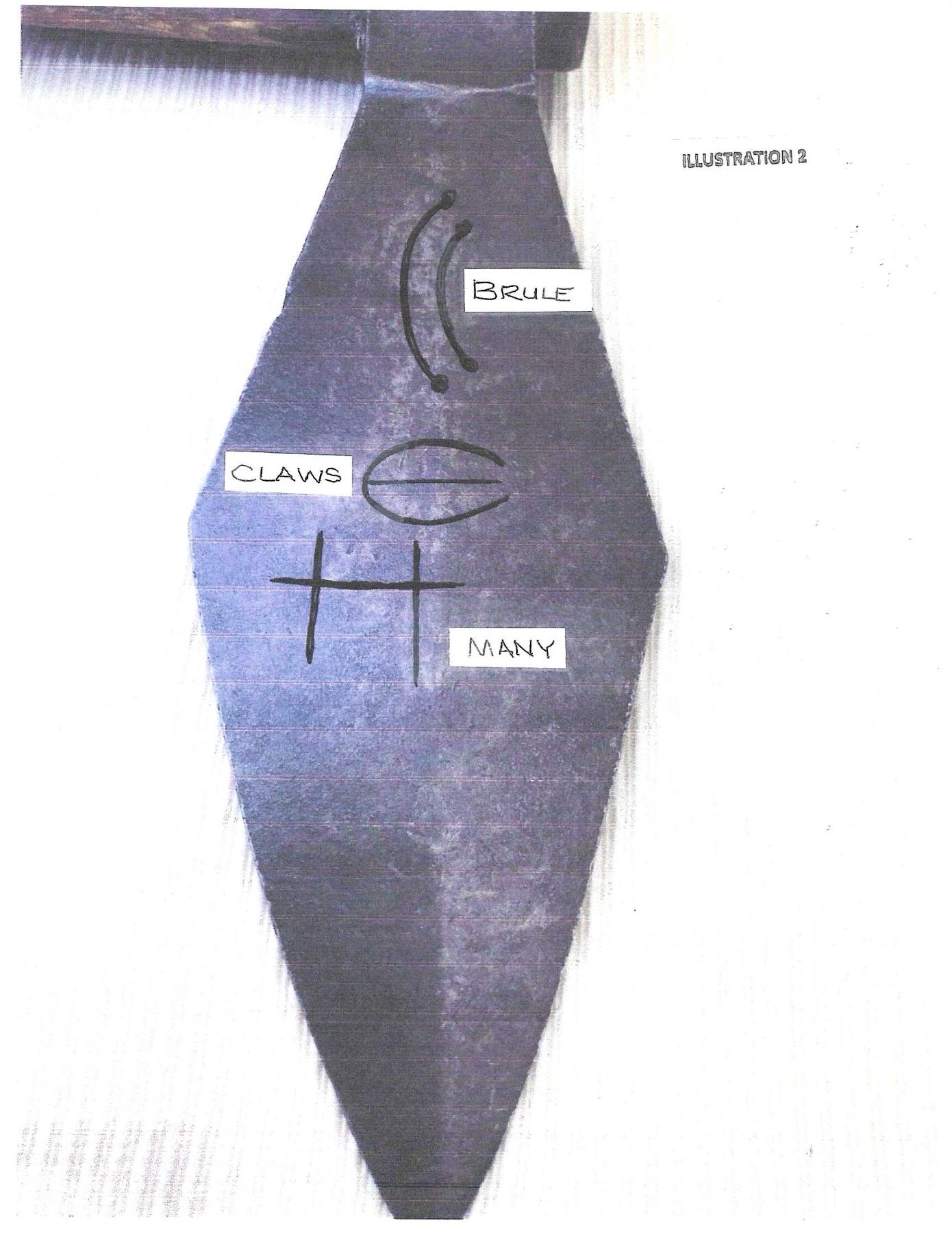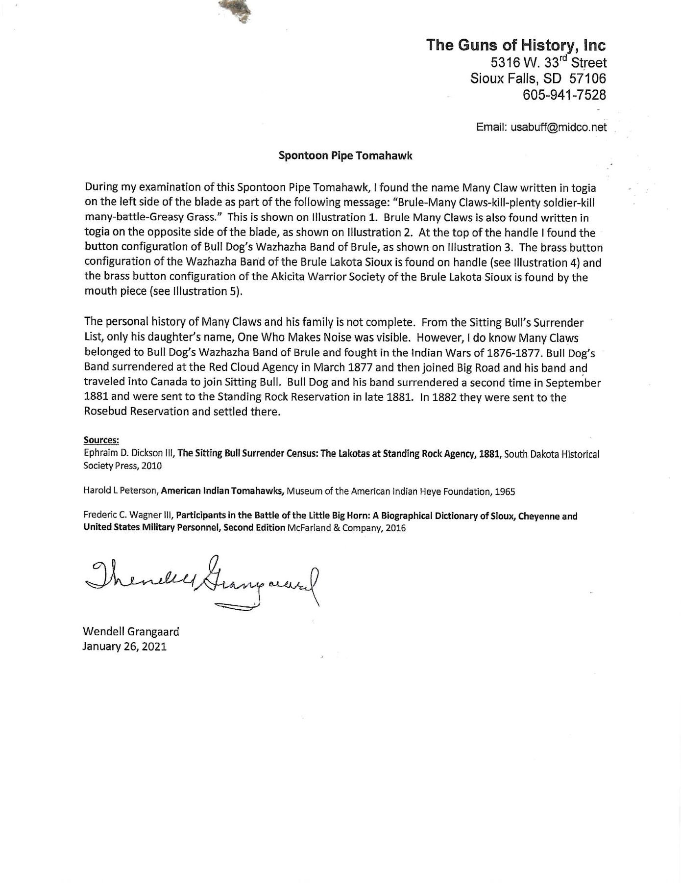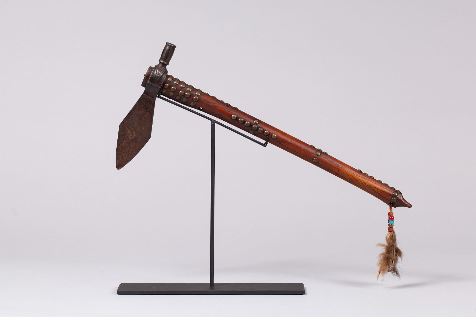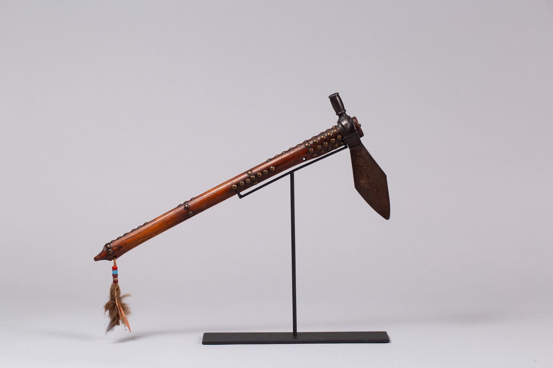 Ca. 1850s-1870s, Important Tomahawk associated with the Brule Sioux, Many Claws as documented by Wendell Grangaard (see photos for additional information). Plains Spontoon Pipe Tomahawk with Buffalo hair drop, haft showing signs of significant use and brass tacks aligned with significant meaning. Blade length 8 ¾”, Width 2 2/8”, Bowl Depth 1 ½”, Haft measures 19”. Comes with an attractive custom stand.