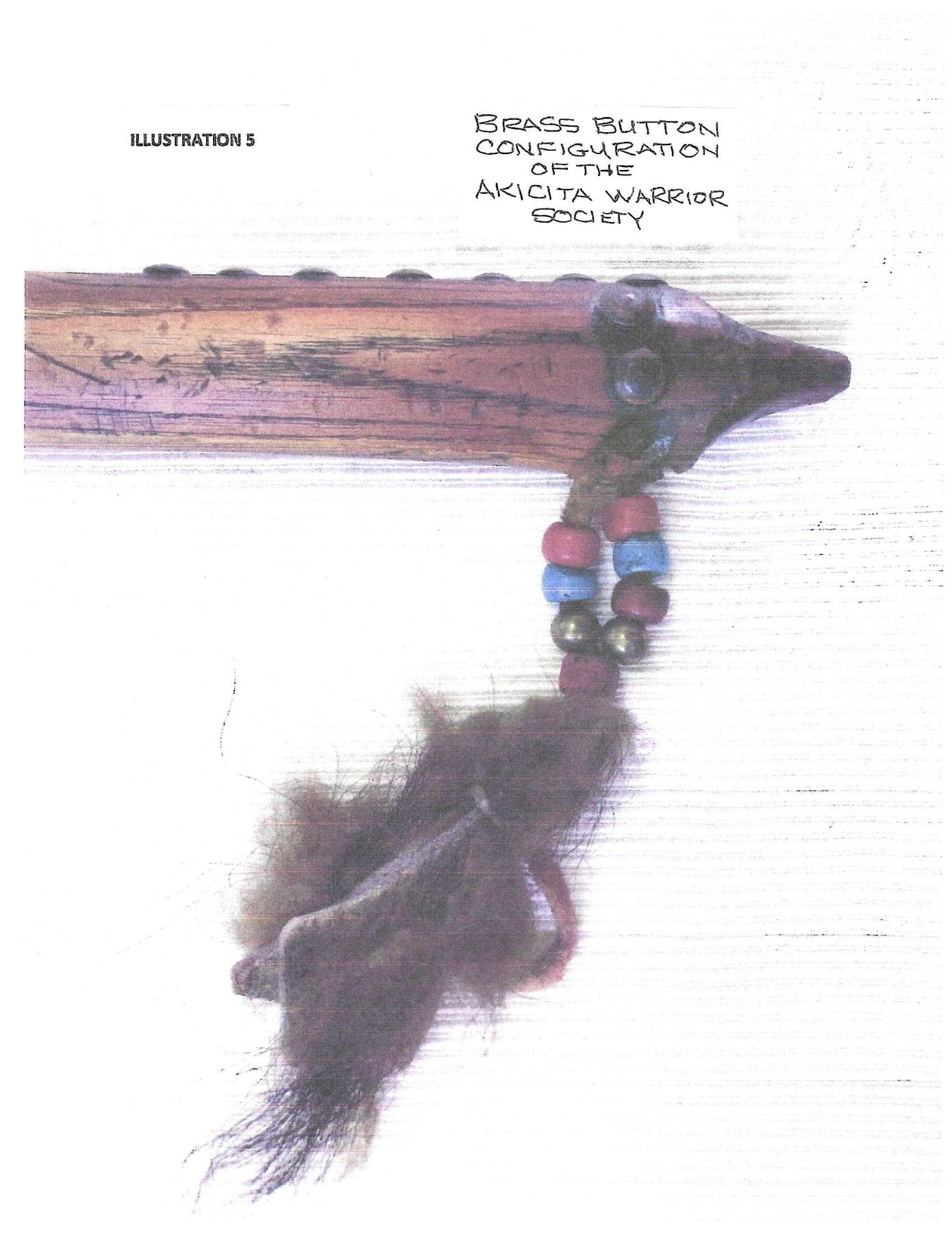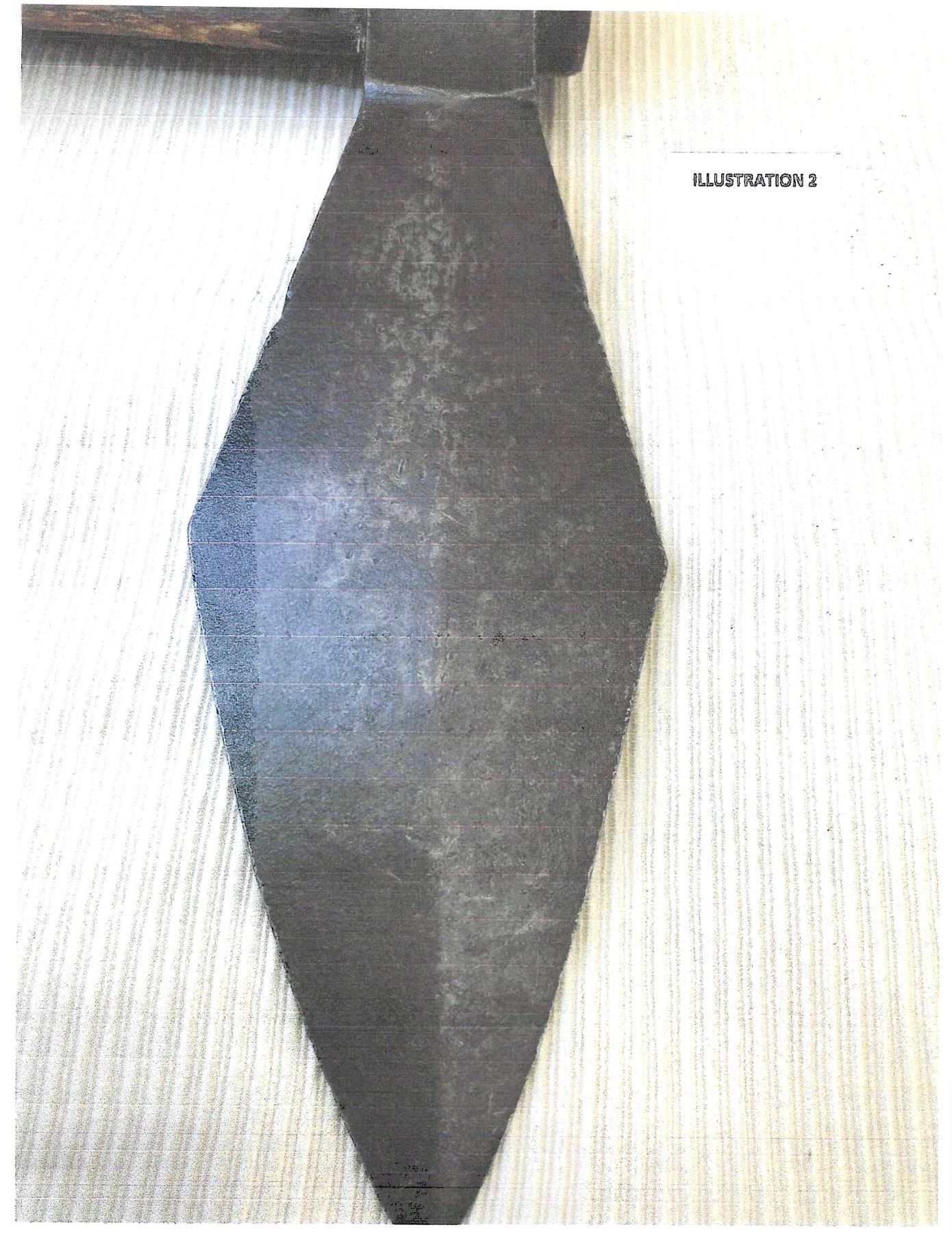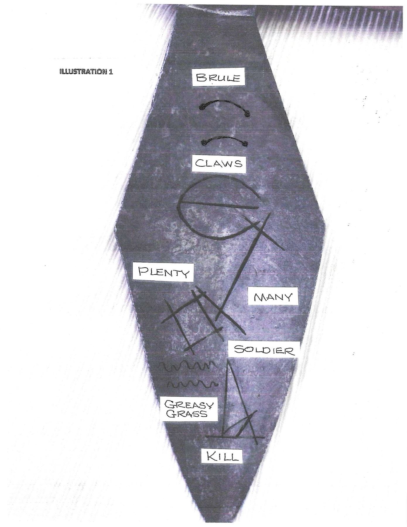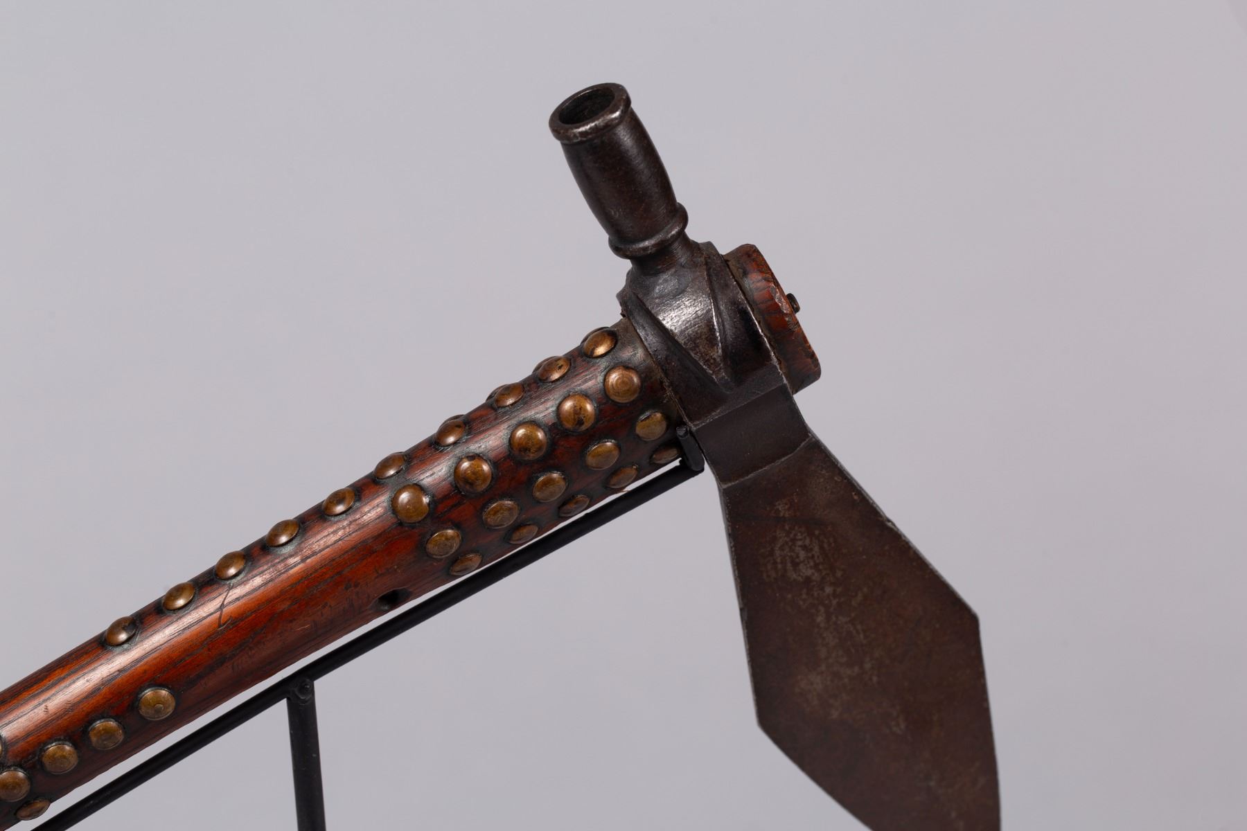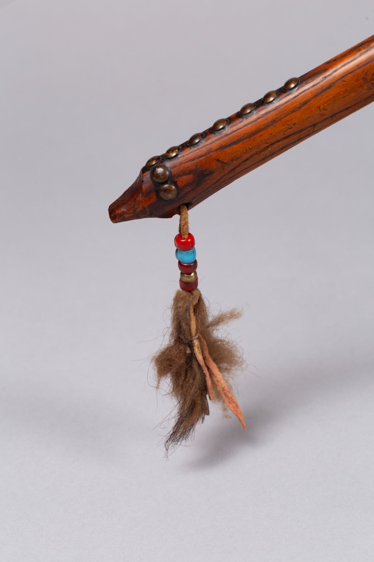 Ca. 1850s-1870s, Important Tomahawk associated with the Brule Sioux, Many Claws as documented by Wendell Grangaard (see photos for additional information). Plains Spontoon Pipe Tomahawk with Buffalo hair drop, haft showing signs of significant use and brass tacks aligned with significant meaning. Blade length 8 ¾”, Width 2 2/8”, Bowl Depth 1 ½”, Haft measures 19”. Comes with an attractive custom stand.