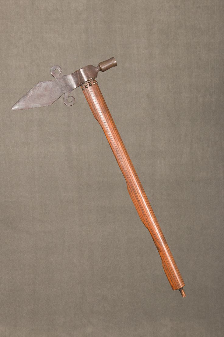 Spontoon Type Pipe Tomahawk. 24" tacked wooden haft, iron head is 11" wide.