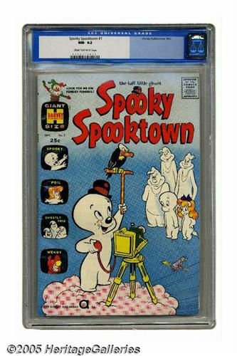 <B>Spooky Spooktown #1 (Harvey, 1961) CGC NM- 9.2 Cream to off-white pages.</B></I> Finding high-grade square bound Harveys is so tough, it's spooky! The title character is joined by Poil, the Ghostly Trio, Wendy, and of course Harvey VIP Casper. Overstreet 2005 NM- 9.2 value = $250. CGC census 7/05: 1 in 9.2, 4 higher.