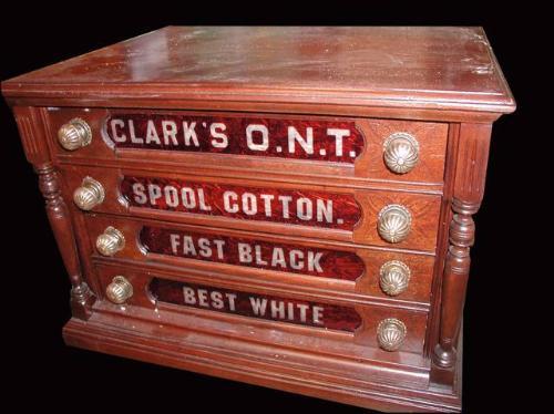 Spool Cabinet, Clark''s ONT Four Drawer Mahogany with Ruby Red Glass Inserts.