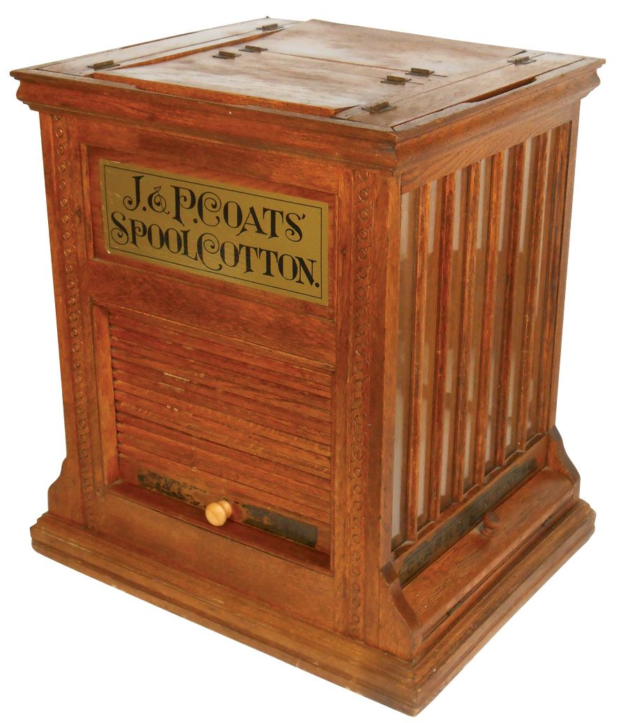 Spool cabinet, J. & P. Coats', oak w/roll up doors & glass windows on sides, c.1910, VG cond w/repla