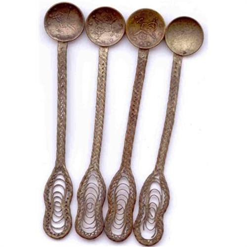 4 hand made hot tea spoons; from coins, hand woven handles.