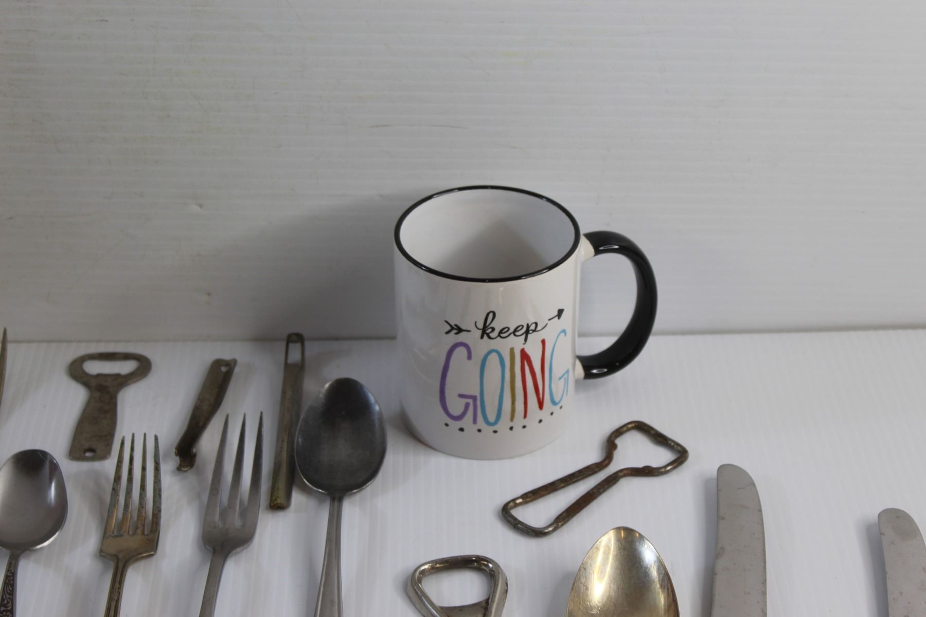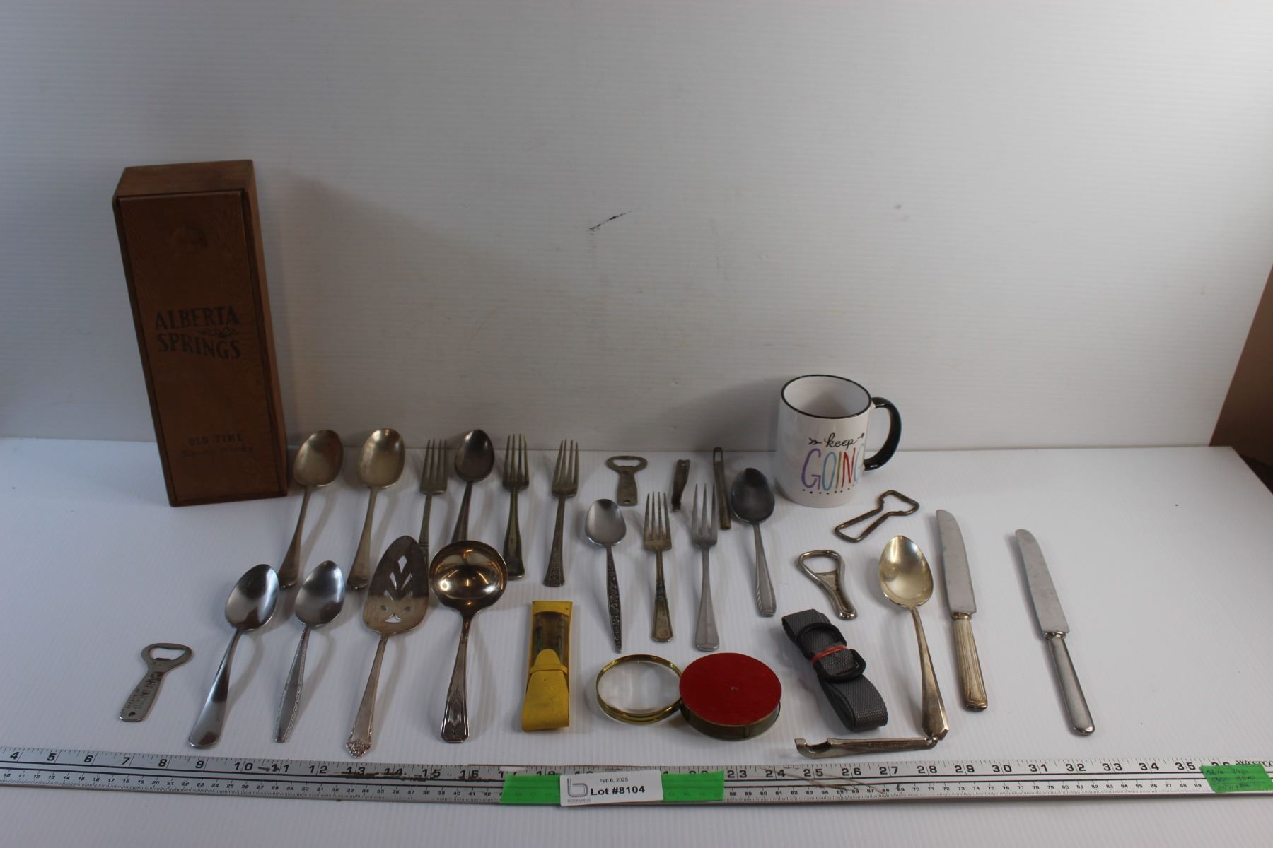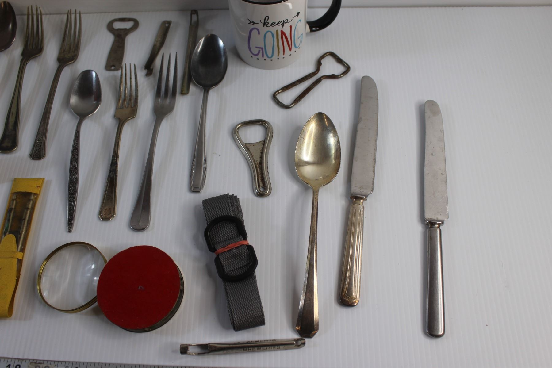 Spoons, Forks, Bottle Openers, Dining Knives, Magnifying Glass, Ceramic Mug and Misc.
